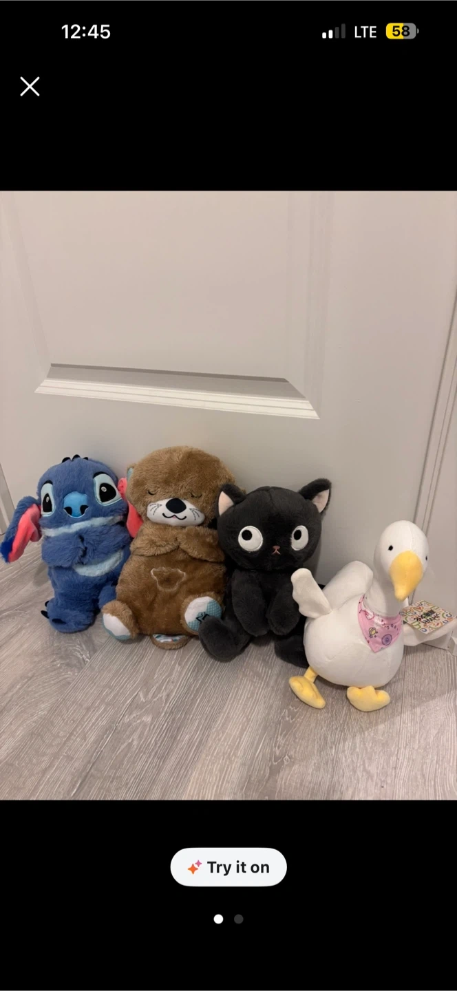 Selling a collection of cute plush toys! There's a Stitch, an otter with a light-up tummy, a black cat, and a goose. They're all in great condition and ready for a new home!
