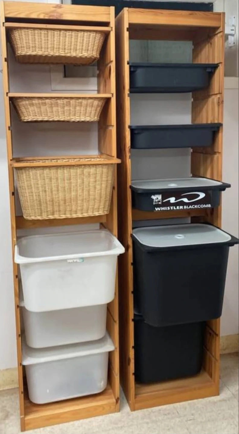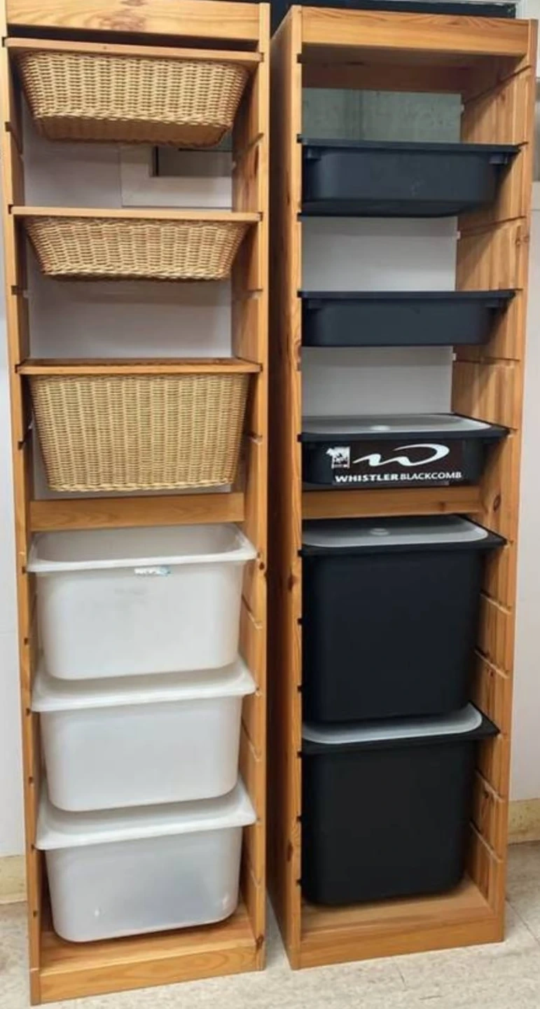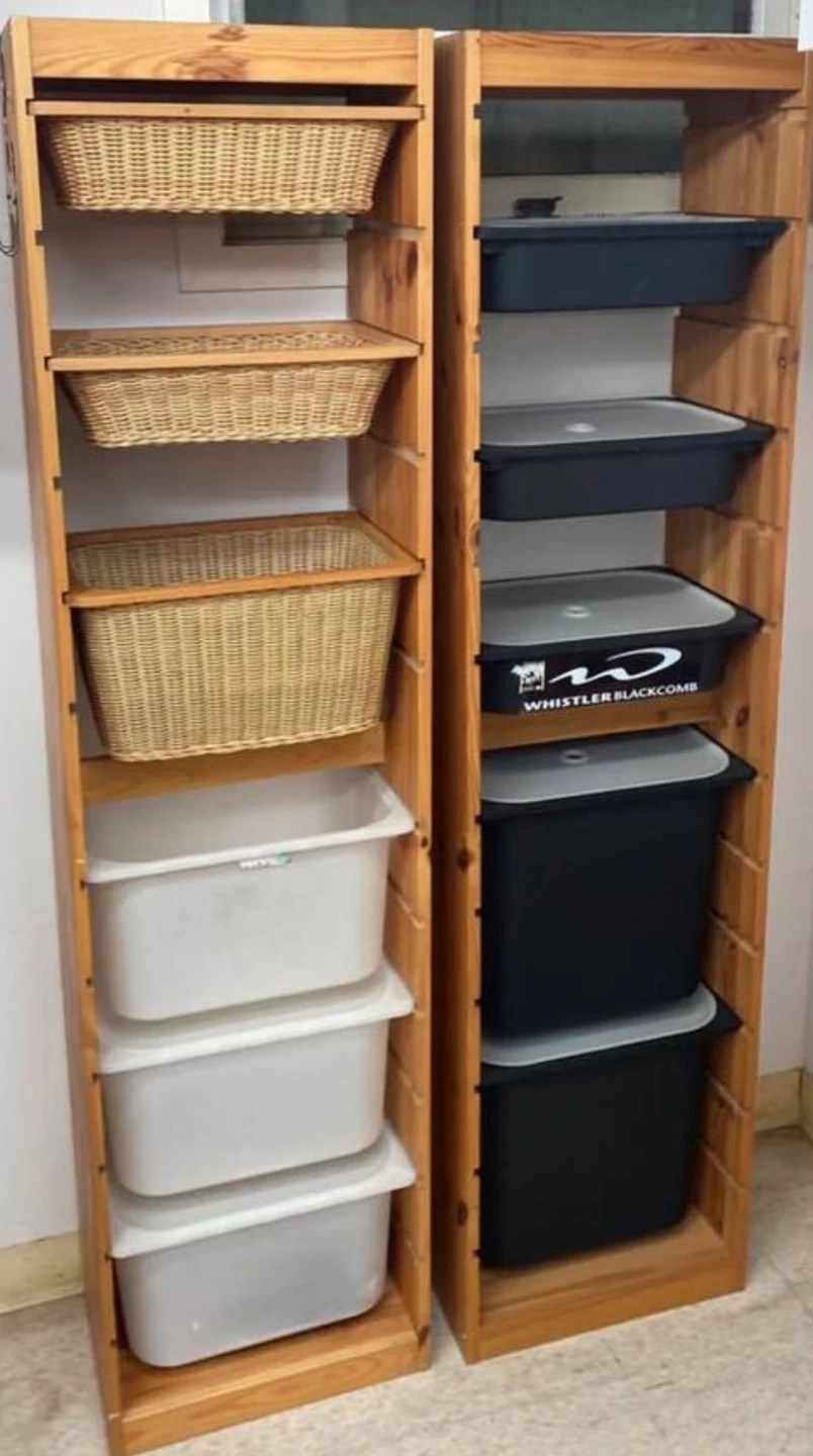 Organize any room with these solid pine adjustable storage towers, complete with a mix of rattan baskets, white bins, and black Whistler Blackcomb lidded bins.