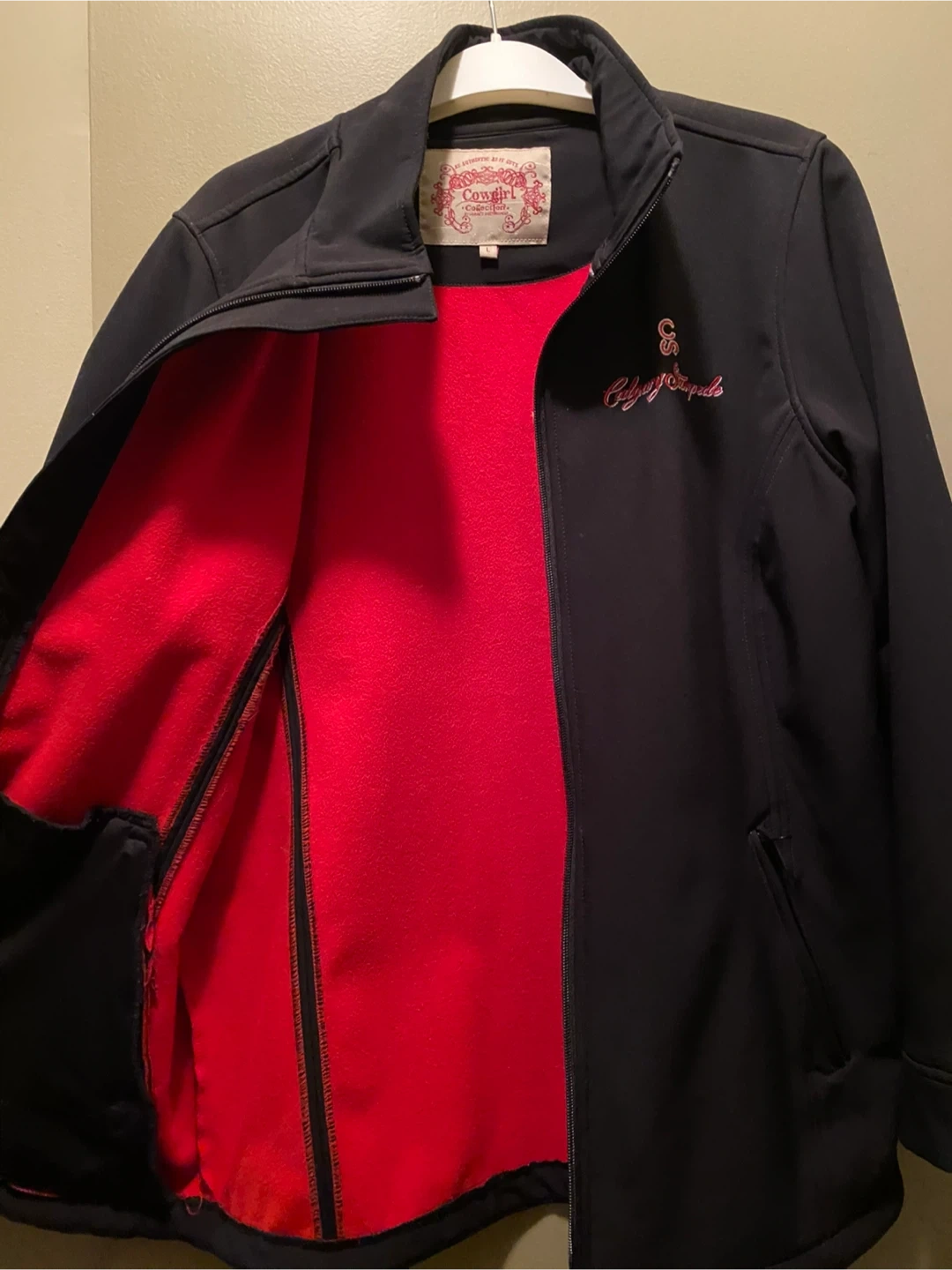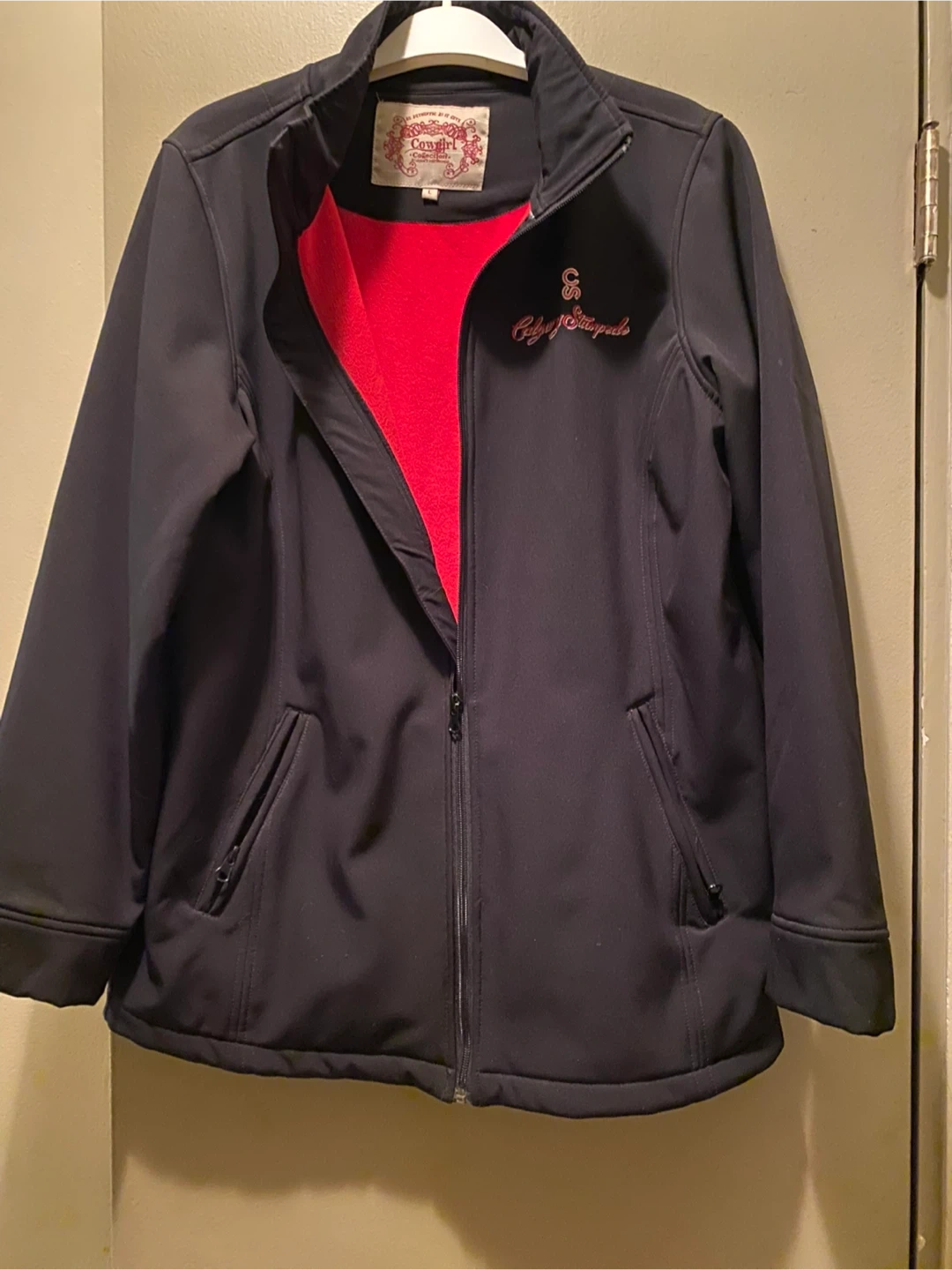 It has a water-resistant exterior, a bright red fleece interior, a full zip front, and two zippered pockets. Pick up Haysboro SW.