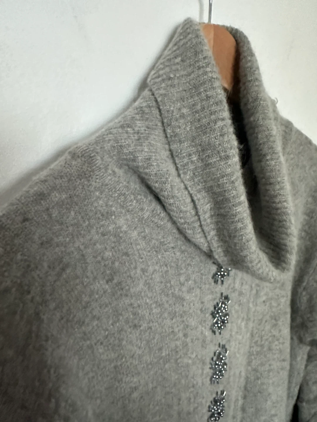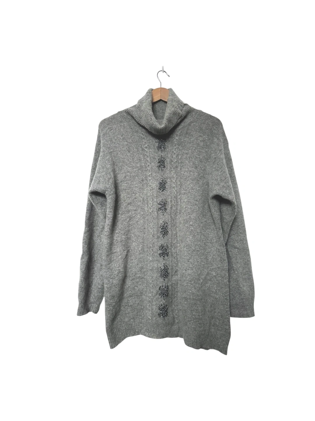 Here's a cozy grey turtleneck sweater with some lovely embellishments down the front! It's in great condition and ready to keep you warm this season. Sweater is long and cozy. Womens Medium.