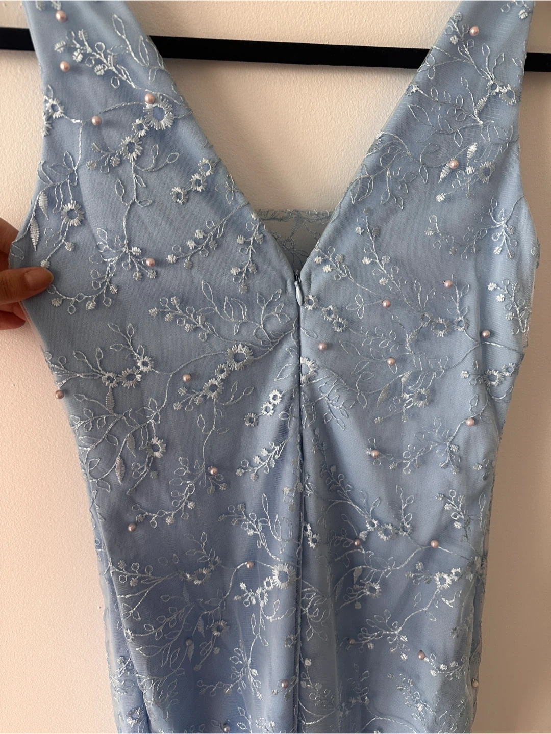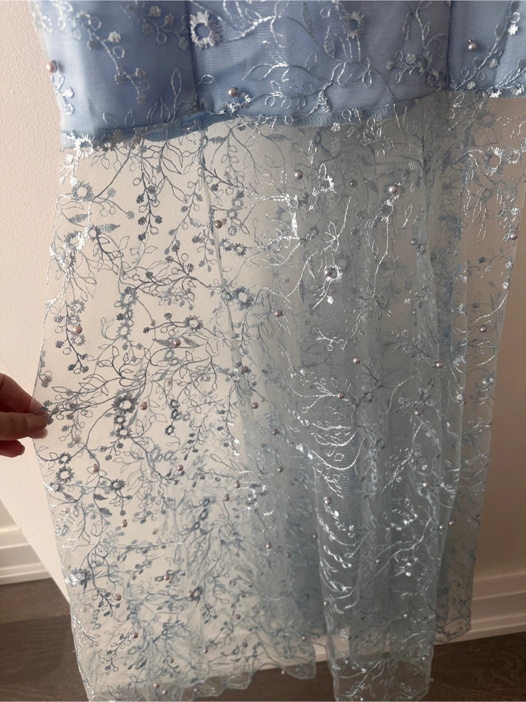 Beautiful blue dress with pearl detailing! It features a V-neck and a sheer lace skirt overlay. Perfect for a special occasion or a night out