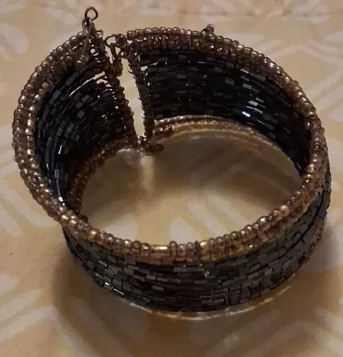 Here's a beaded cuff bracelet! It features a combination of black and gold beads. It would be a great addition to any jewelry collection.