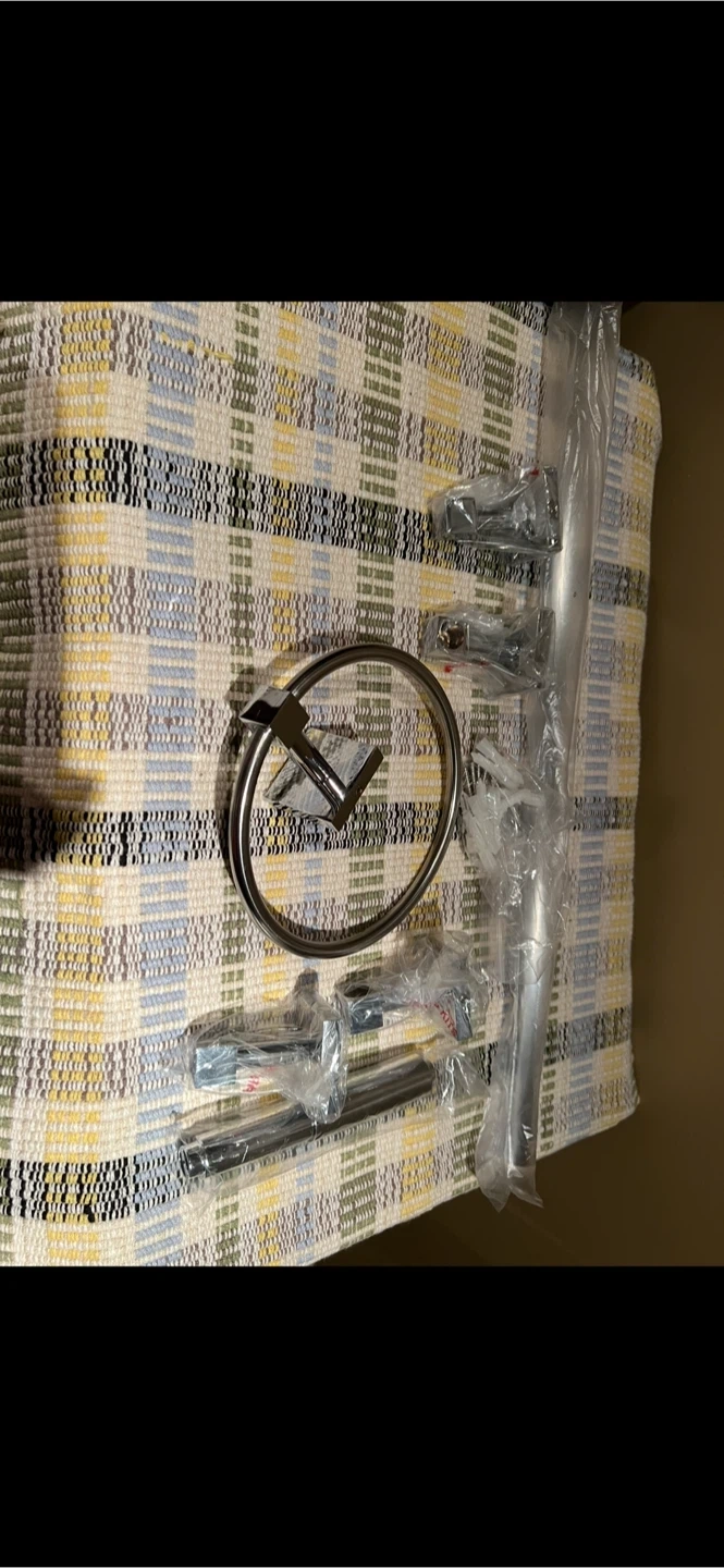 Selling a brand new chrome bathroom hardware set! It includes a towel ring, towel bar, and other mounting hardware. Everything is still in its original packaging.