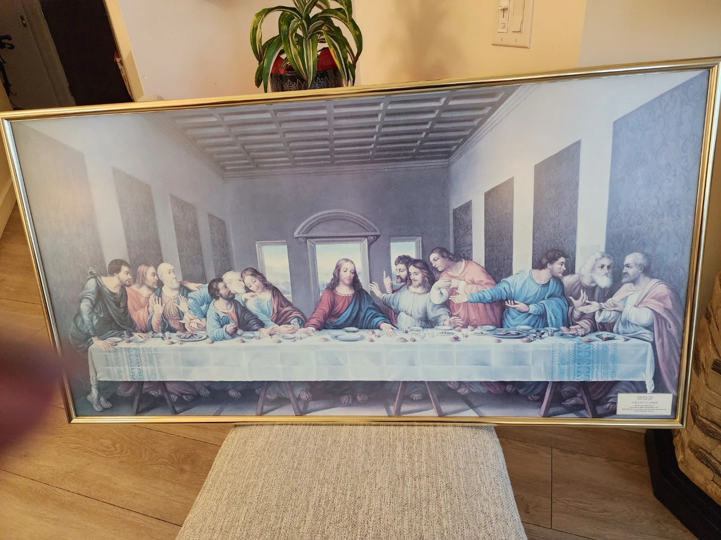 Selling a framed print of Leonardo da Vinci's "The Last Supper". It's a mural in the Refectory of Santa Maria delle Grazie, Milan, 1497. Recreated from the original painting after restoration by Mauro Pelliccioli, 1981-53