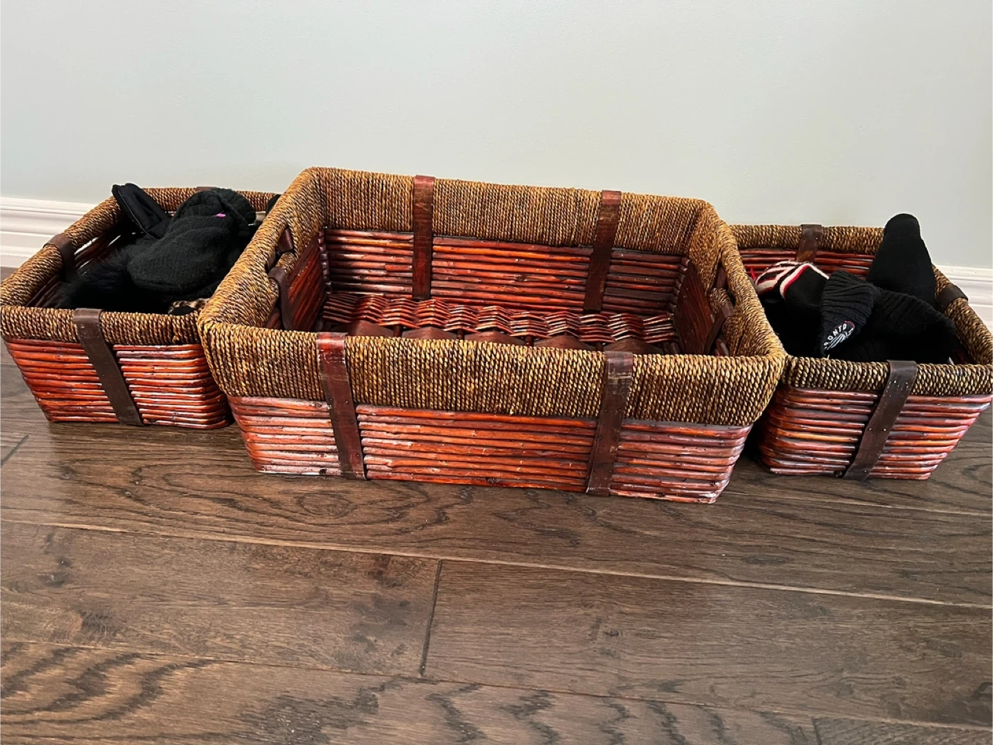 Selling a set of three wicker storage baskets. They are in great condition and perfect for organizing items around the house. The baskets have a warm, natural look that would fit well in any room. Great for storing blankets, toys, or other household items