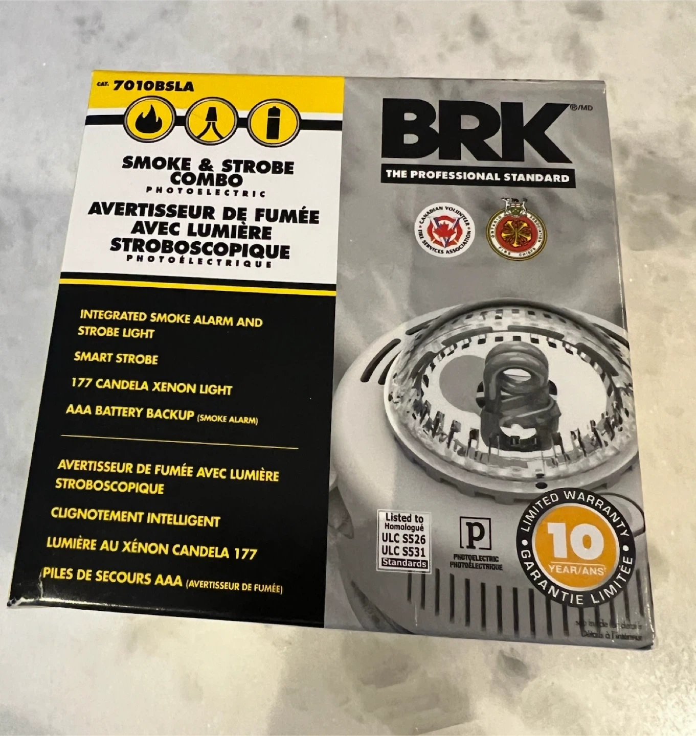 Selling a brand new BRK 7010BSLA Smoke & Strobe Combo! This is a 2-in-1 smoke alarm and strobe light, perfect for ensuring safety. It features an integrated smoke alarm and strobe light, along with a smart strobe with 177 candela xenon light. It also has an AAA battery backup for the smoke alarm. Comes in the original box!