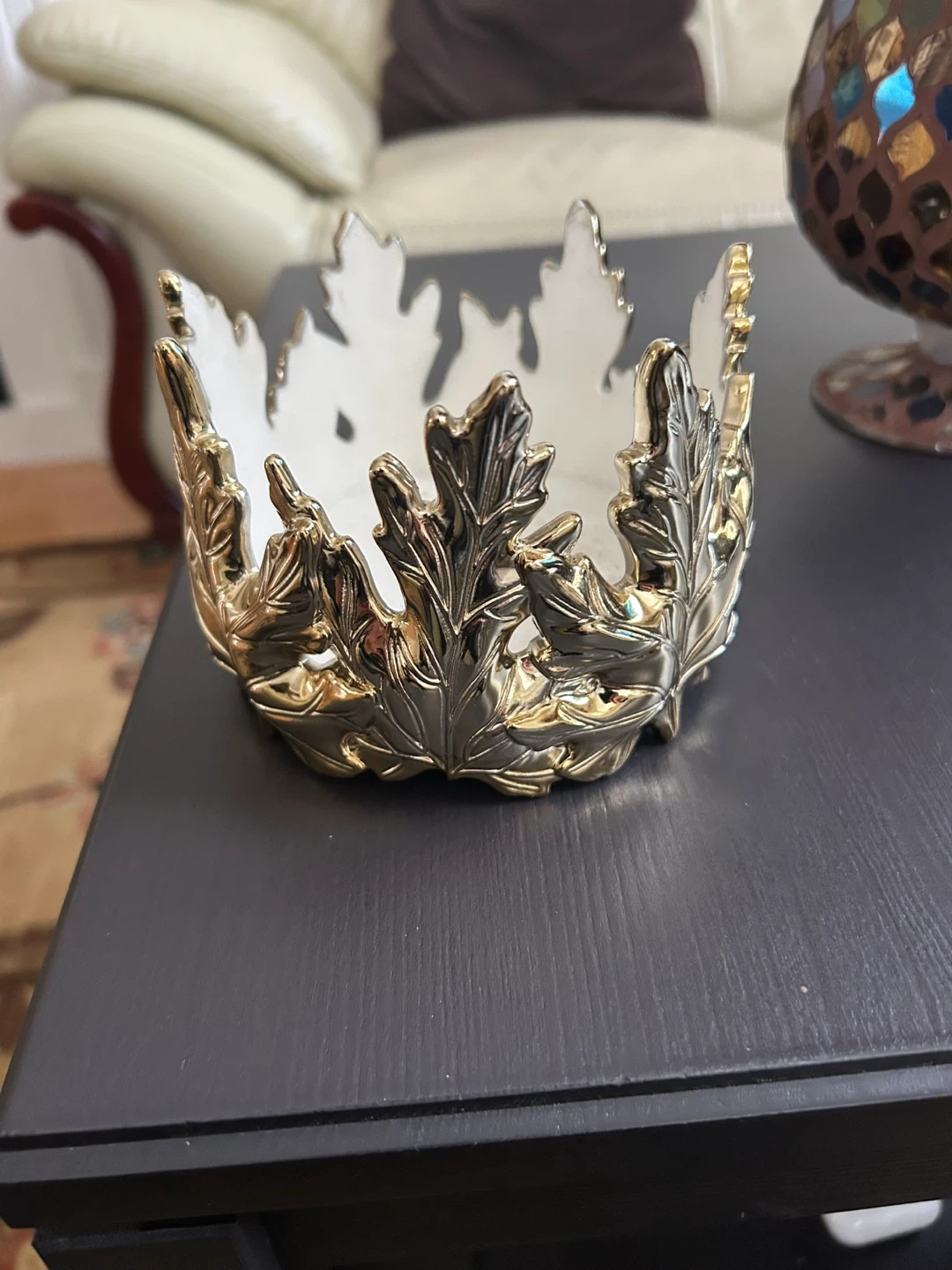 Selling a Bath & Body Works candle holder. It's a lovely gold and white colour with a maple leaf design. Perfect for adding a touch of elegance to any room!