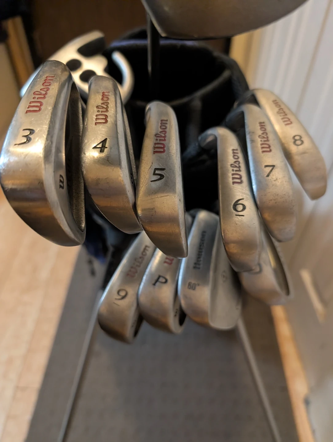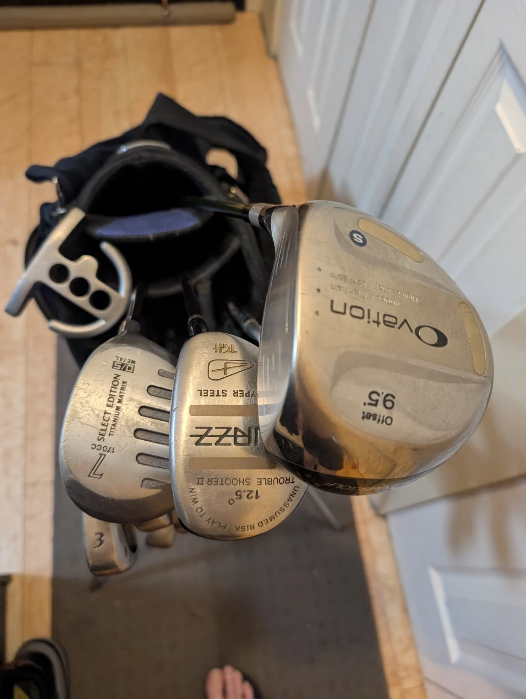 Selling a set of golf clubs including Wilson irons (3, 4, 5, 6, 7, 8, 9, P) and Adams drivers (Ovation 9.5 Offset, IRZZ Trouble Shooter II 12.5). 14 clubs in all. Irons are all matching custom made set from Golf Town. Enough tees to last a season, lots of balls, including 4 sleeves never opened. Has a pair of gently used all weather gloves, as well as a new Top Flyte glove, and a tracer ball that glows red after you hit it for twilight golf and finishing that last hole. All clubs in excellent shape and bag is like new. $200 and you are ready to hit the links. Just book a tee time. Will be a great set of clubs for someone to enjoy.