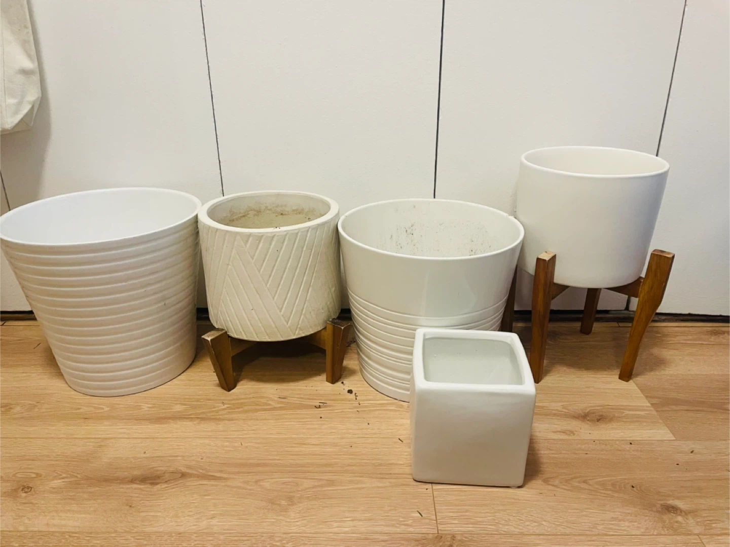 Selling a set of five white ceramic plant pots. They come in various shapes and sizes, perfect for adding a touch of greenery to your space