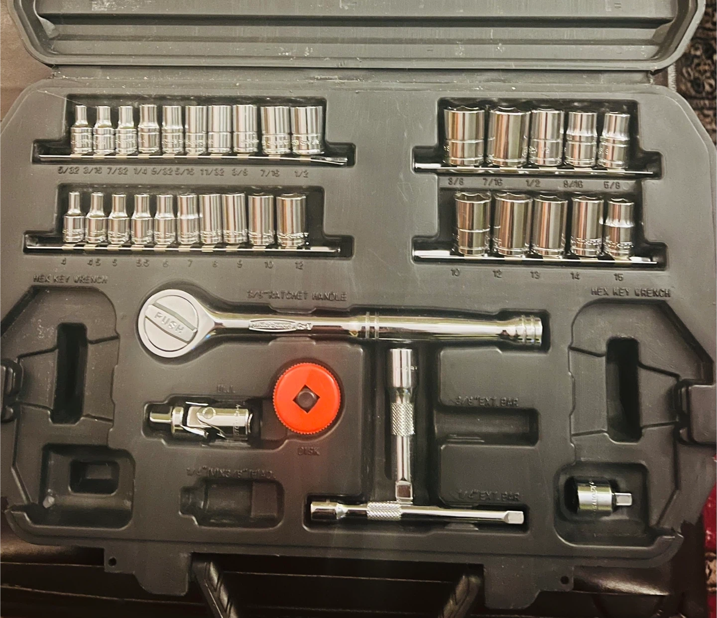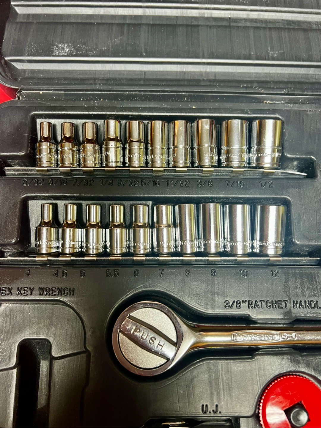 Selling a Workforce socket set that comes with its original case. It includes a variety of sockets, hex key wrenches, a ratchet handle, and extension bars. Great for any DIY projects or repairs!