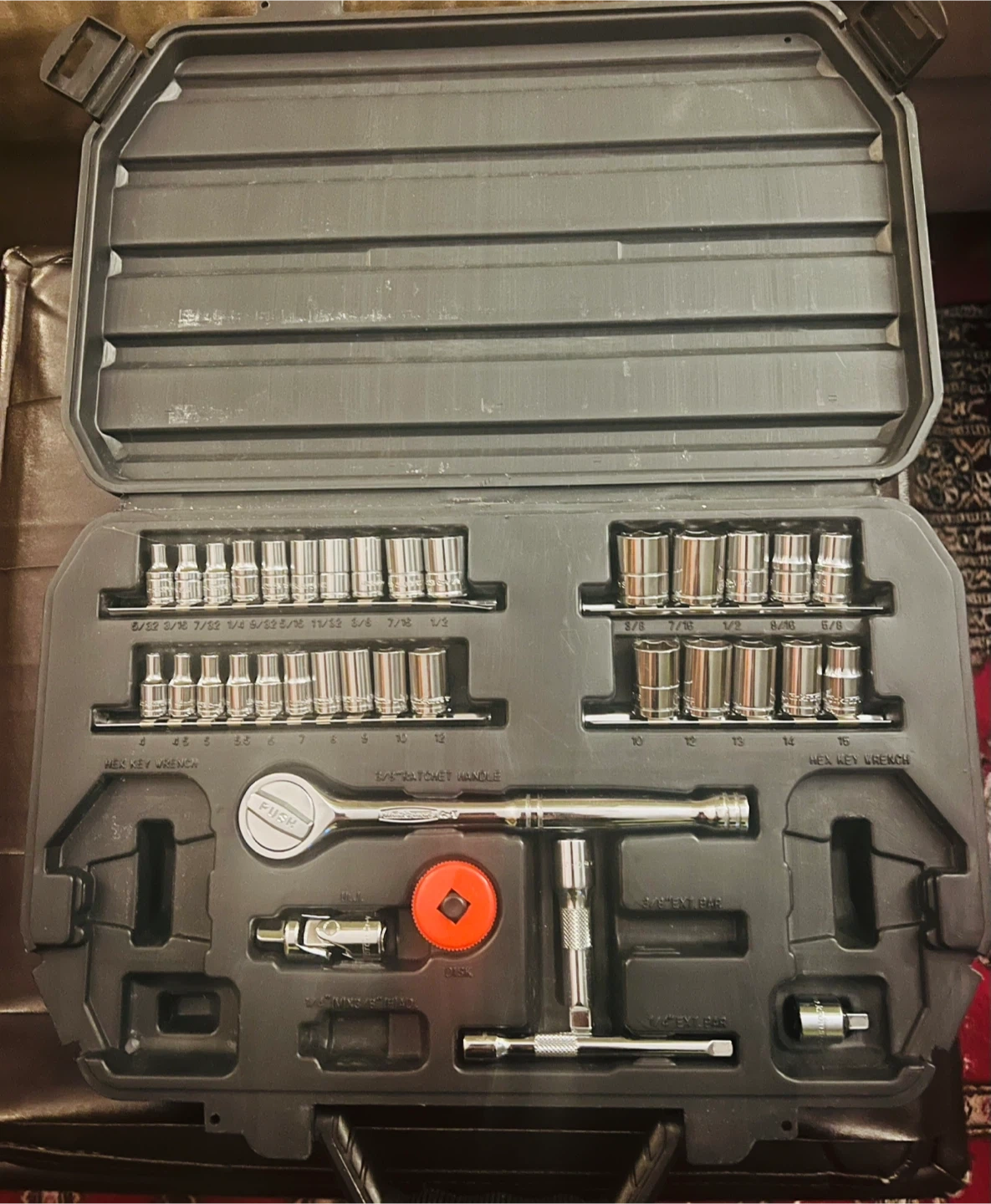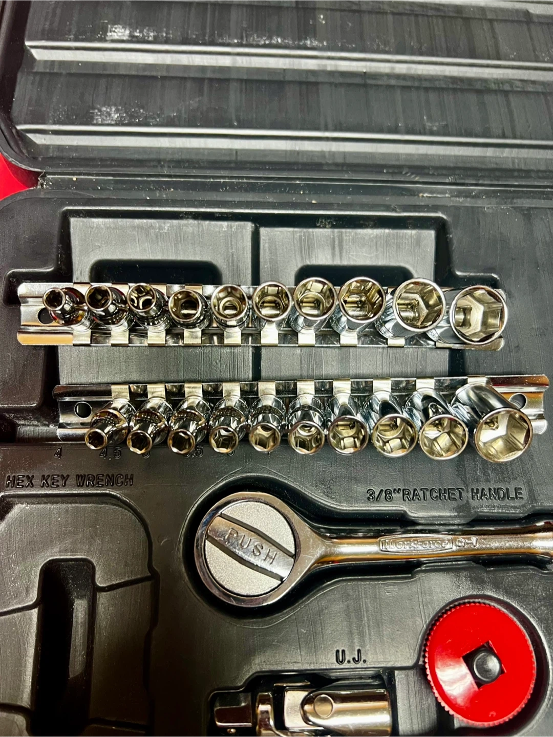 Selling a Workforce socket set that comes with its original case. It includes a variety of sockets, hex key wrenches, a ratchet handle, and extension bars. Great for any DIY projects or repairs!
