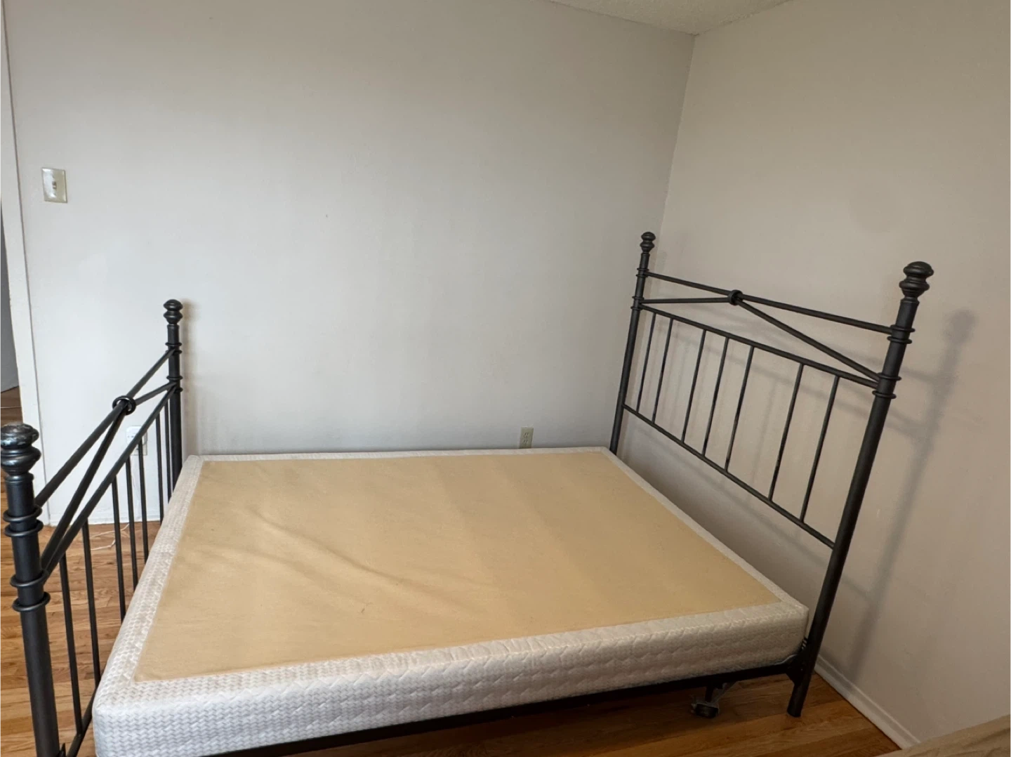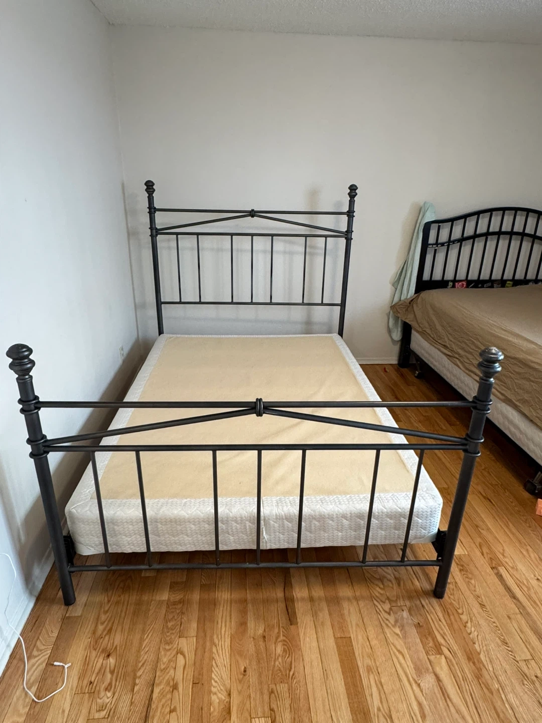 Selling a metal bed frame in black. It's in good condition and ready for a new home. Perfect for adding a touch of elegance to your bedroom