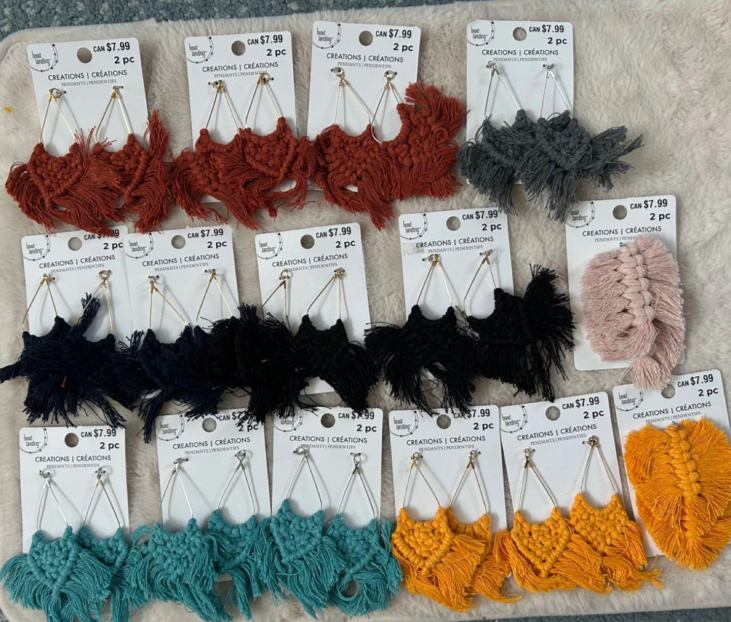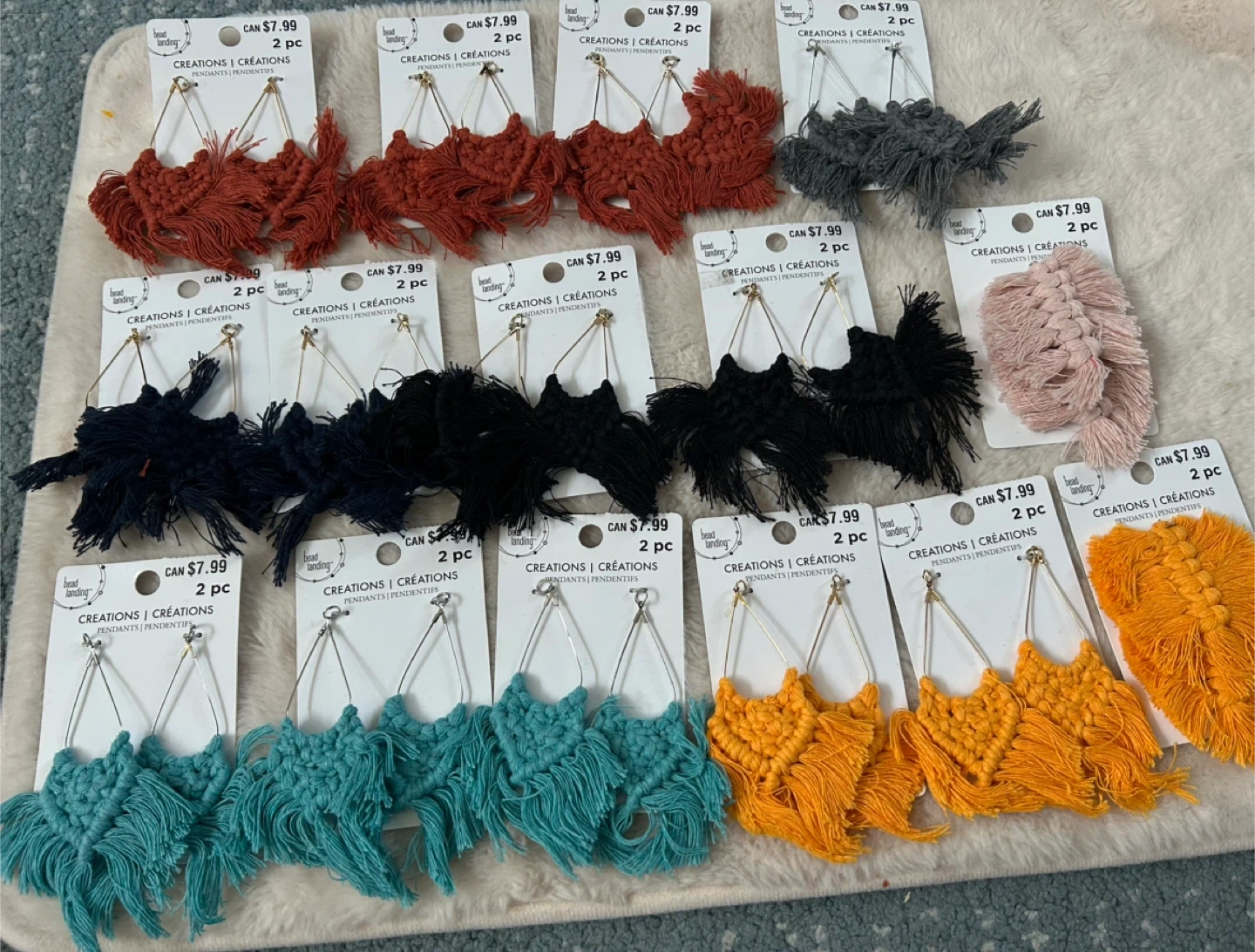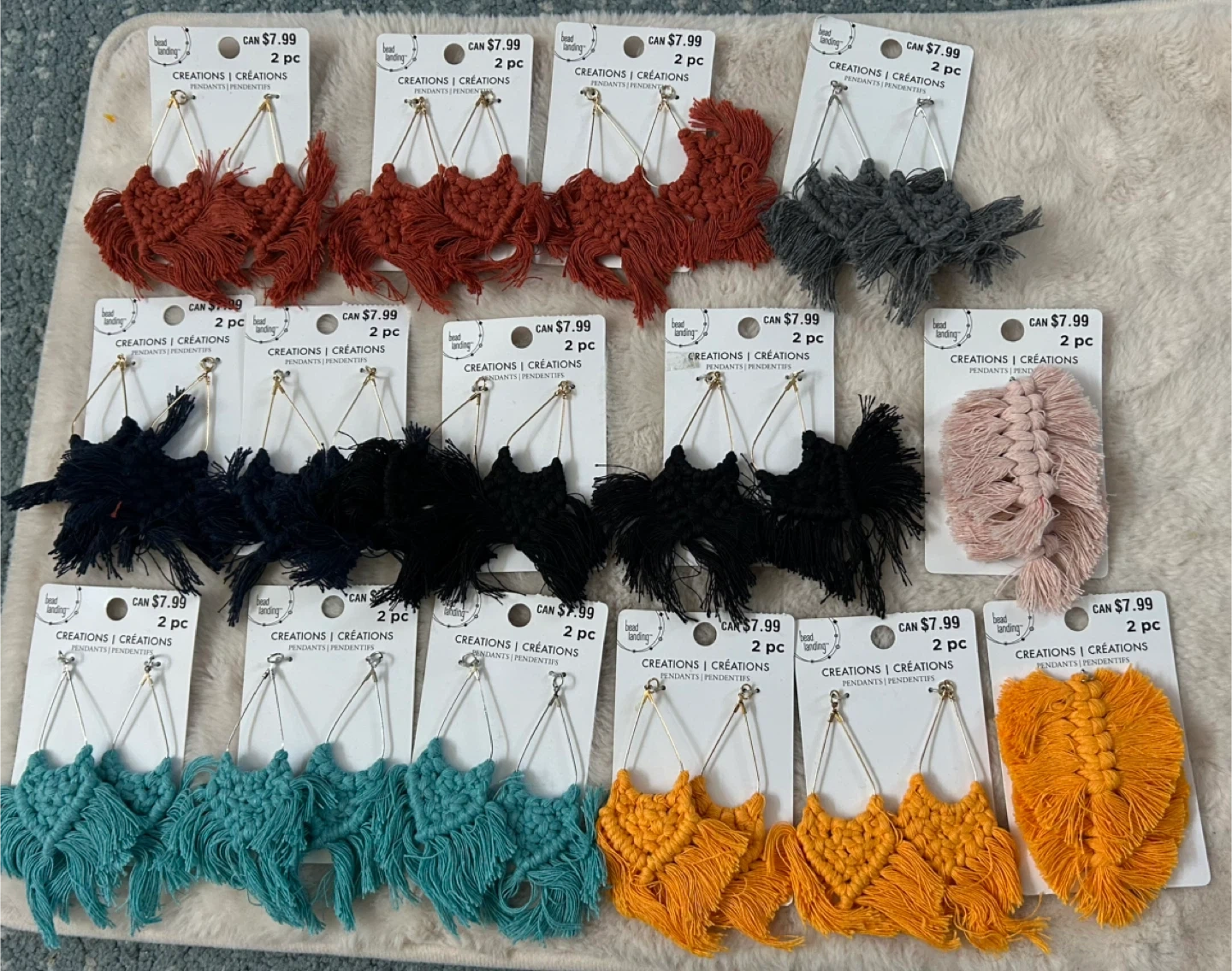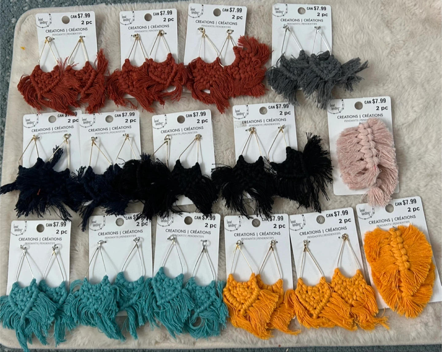 I have a selection of macrame earring pendants for sale! They are brand new and come in a variety of colours. Each pack contains 2 earring pendants. They retail for $7.99 each. I’m selling all for $15