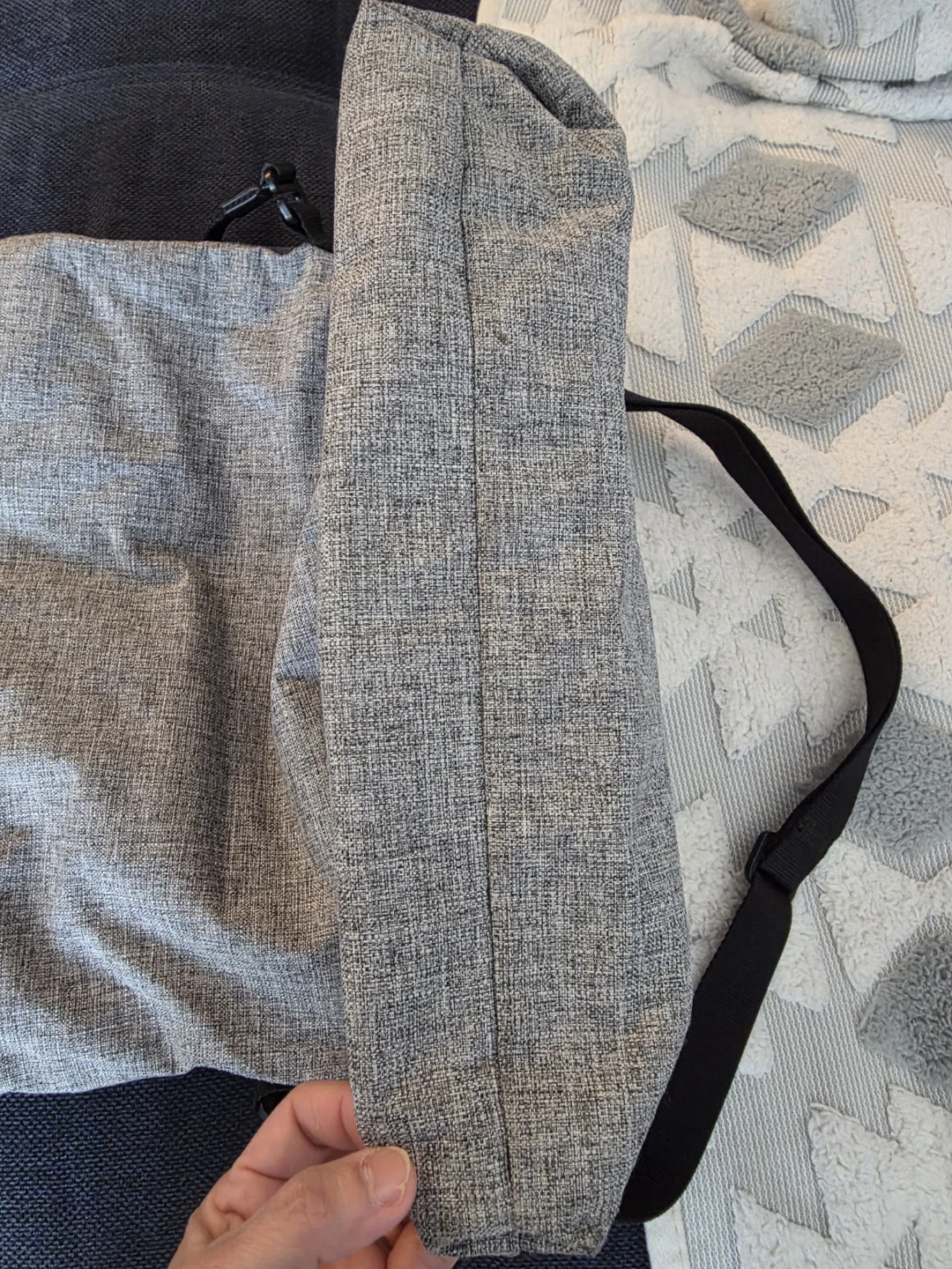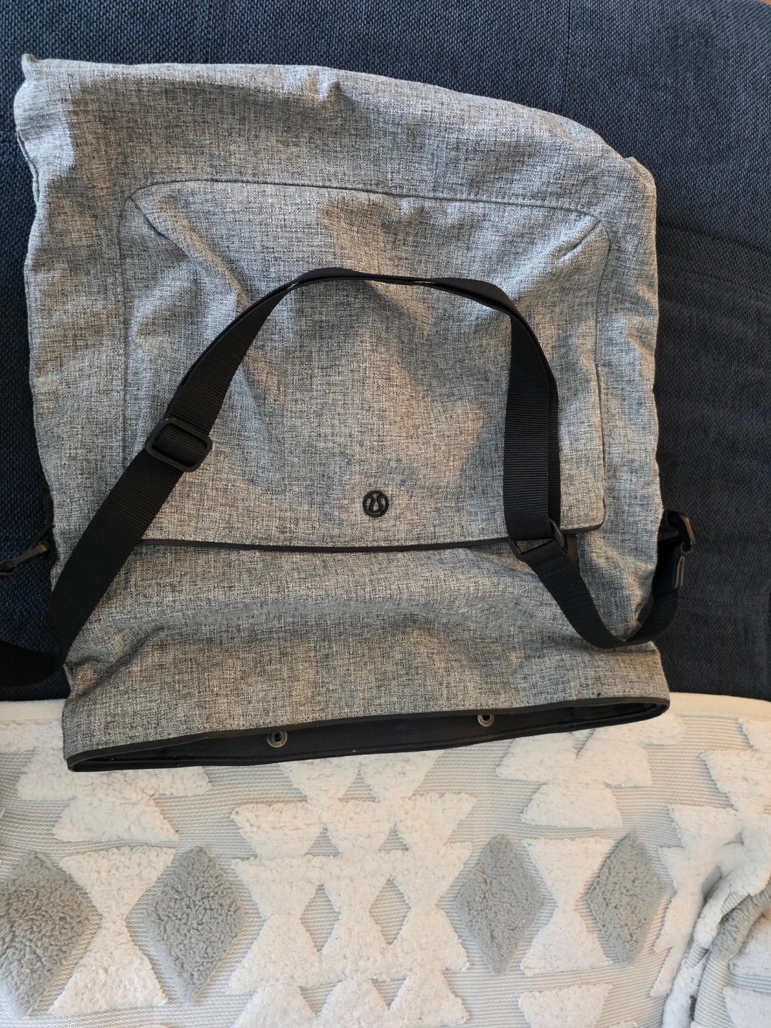 Selling a Lululemon convertible bag in a lovely grey colour! It's in great condition . The bag features a black strap and a spacious interior, . It can be use as a lunch bag too