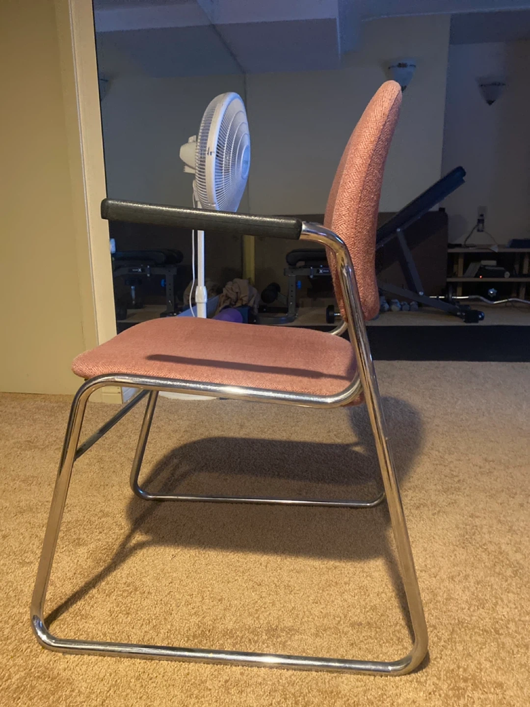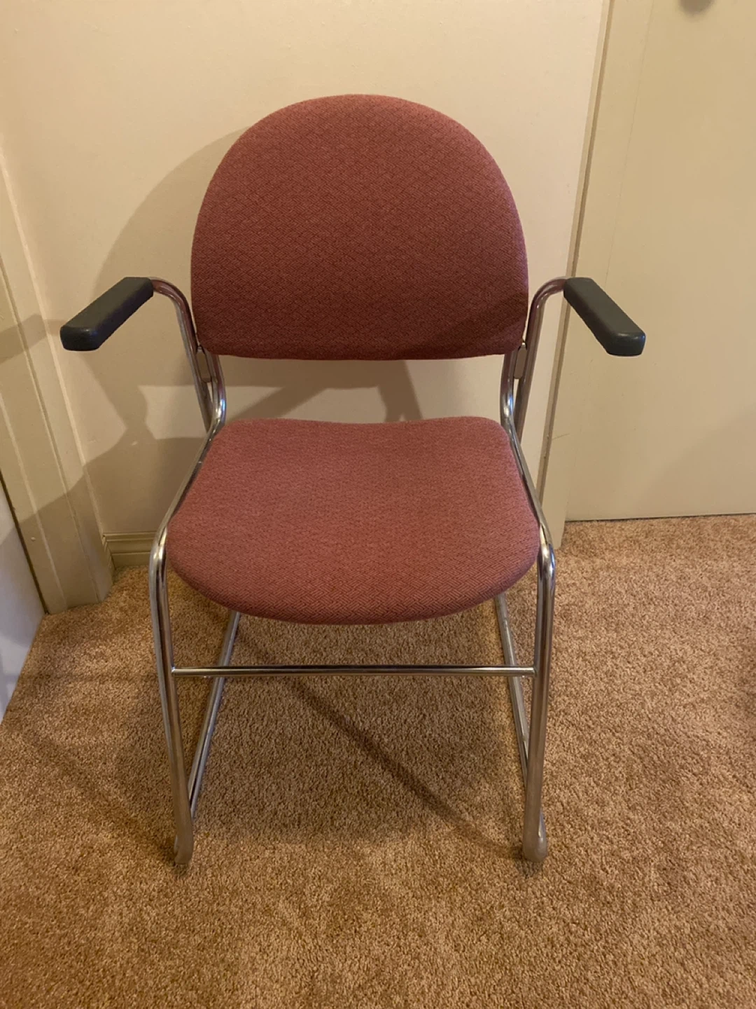 Selling armchairs, hey have a chrome frame and a reddish-brown fabric seat and back. Great for an office or waiting room!