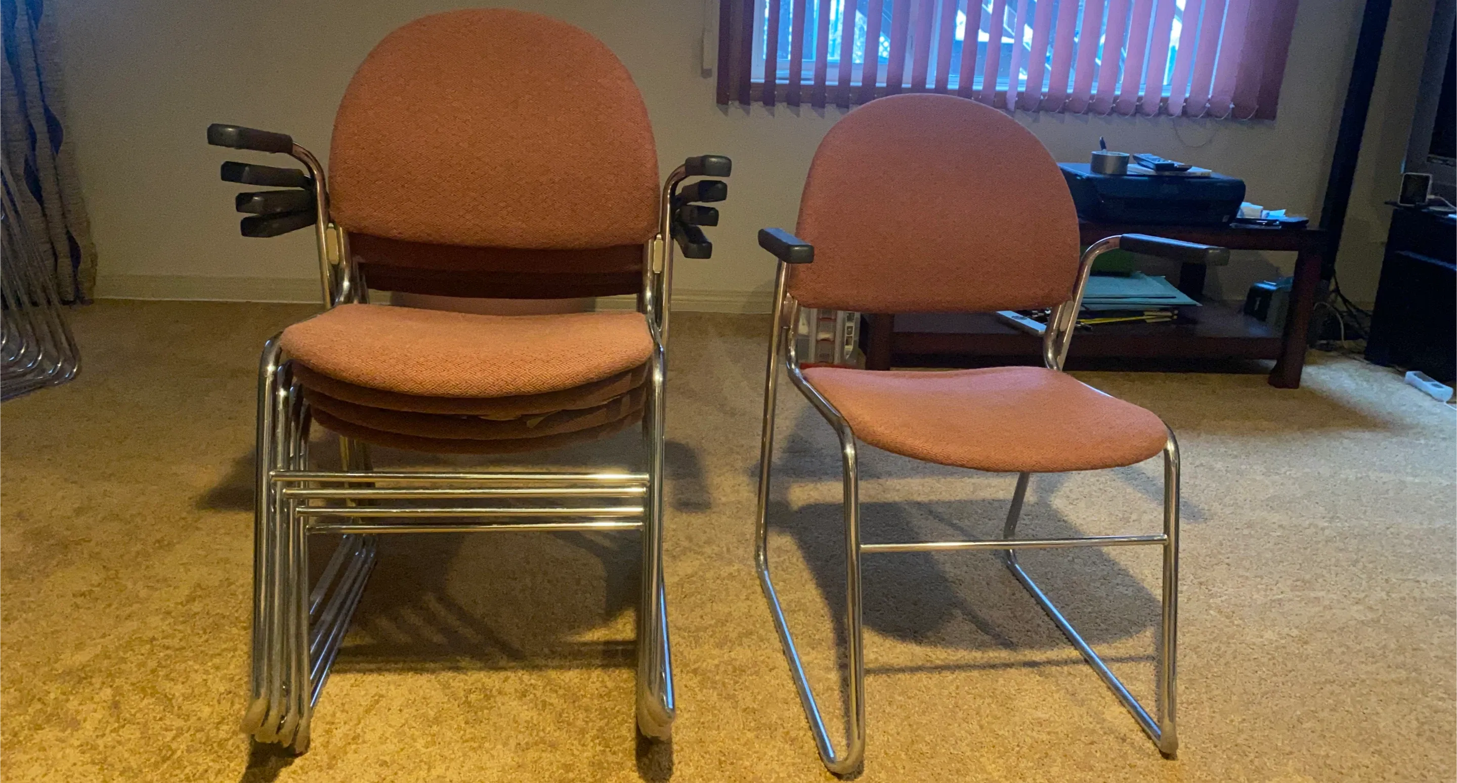 Selling armchairs, hey have a chrome frame and a reddish-brown fabric seat and back. Great for an office or waiting room!