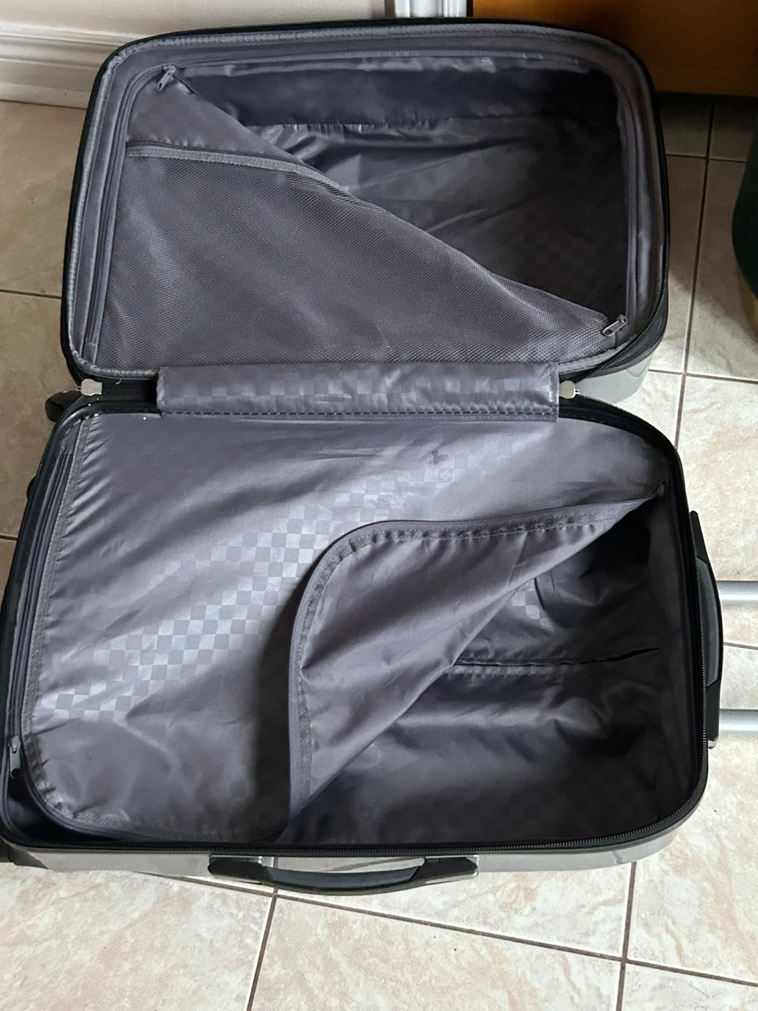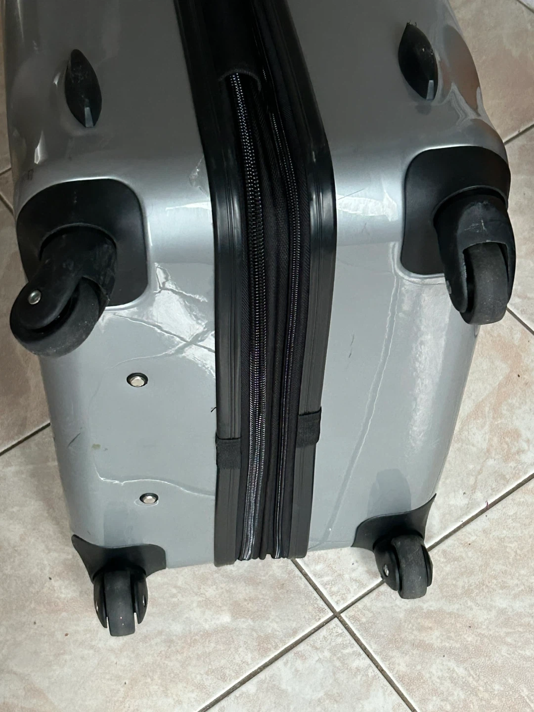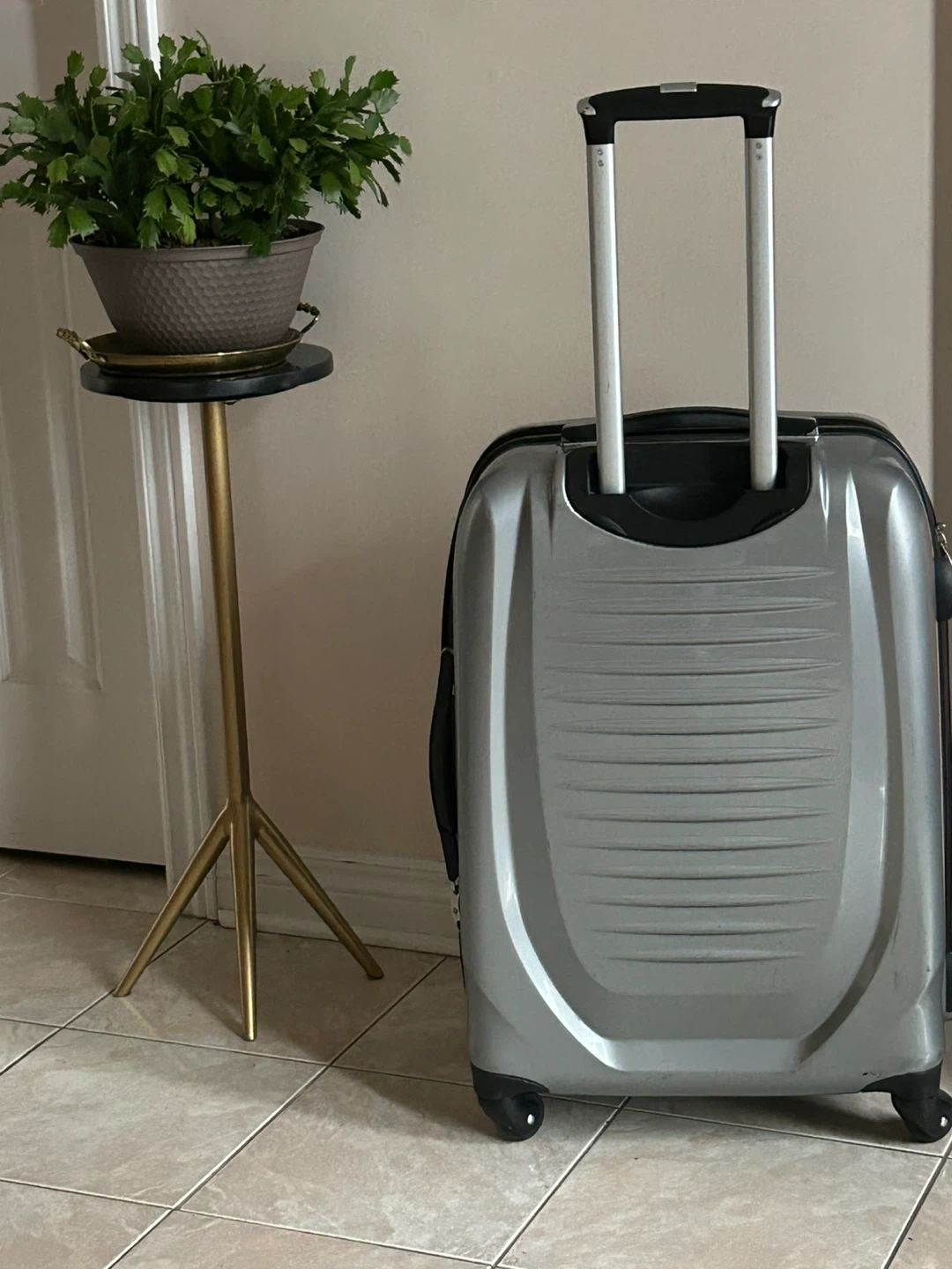 Selling a Samsonite spinner check in suitcase in silver. It has some scratches from use, but is still in good working condition. Perfect for your next trip!