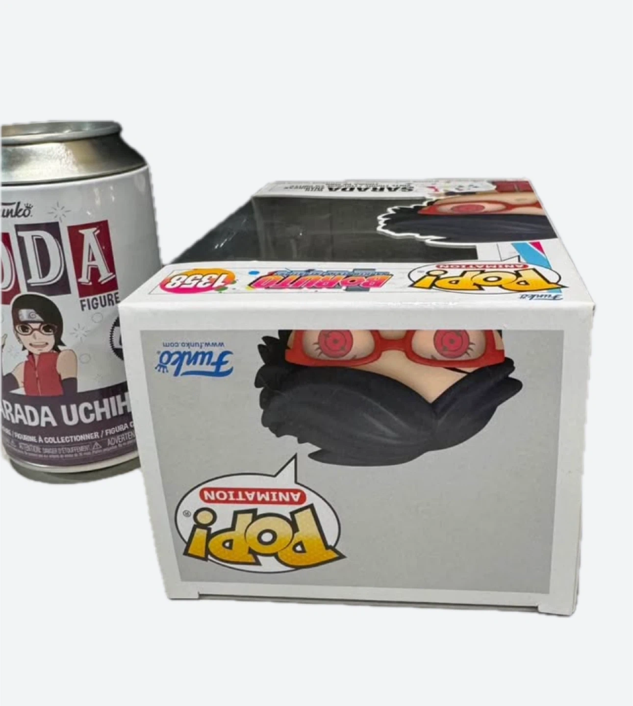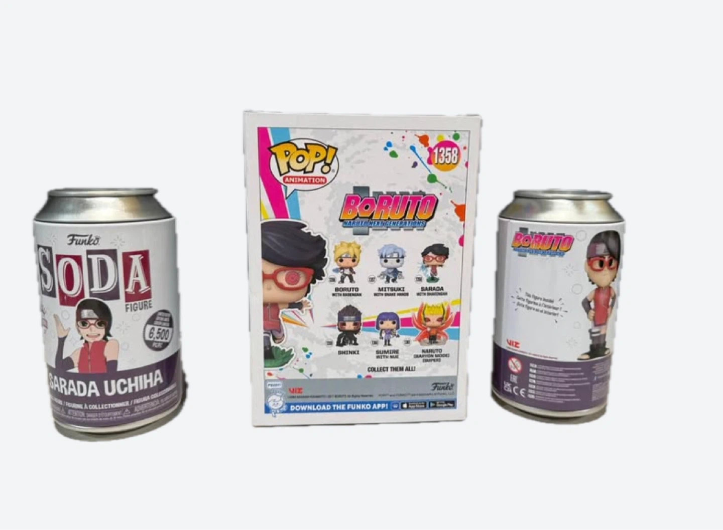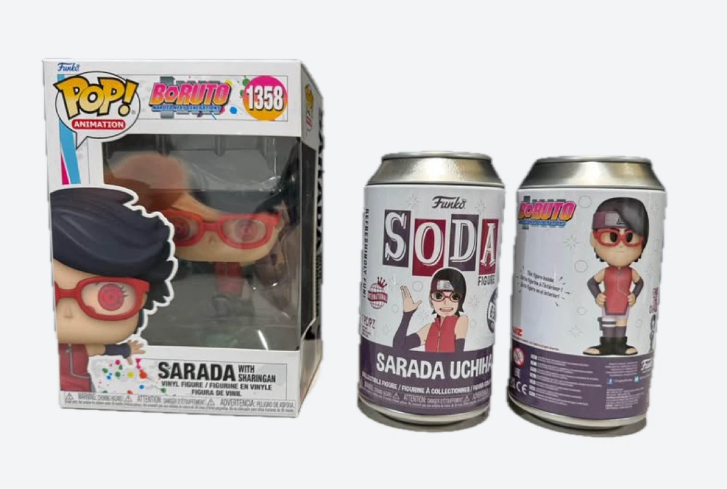 Funko Soda and a Funko Pop! of Sarada Uchiha from Boruto.