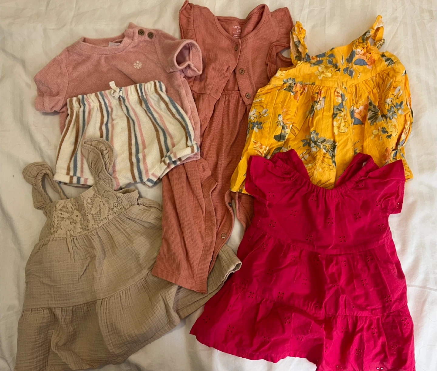 A cute bundle of baby girl clothes! Includes dresses, shorts, and a onesie. All in great condition and ready for a new little one