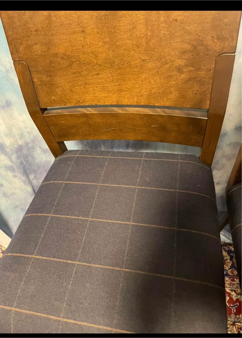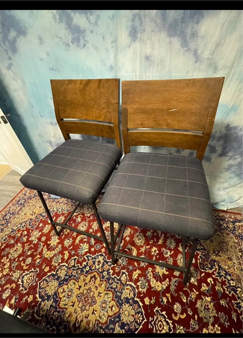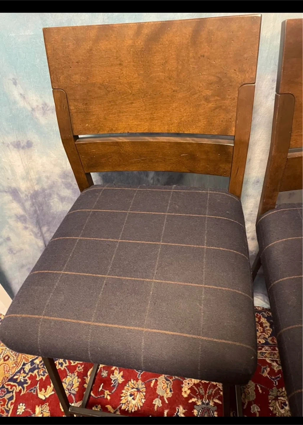 Selling a set of two high counter chairs! Custom made from Ashley’s, they feature a wood frame and a plaid upholstered seat. Perfect for adding a touch of classic style to your dining area or kitchen.