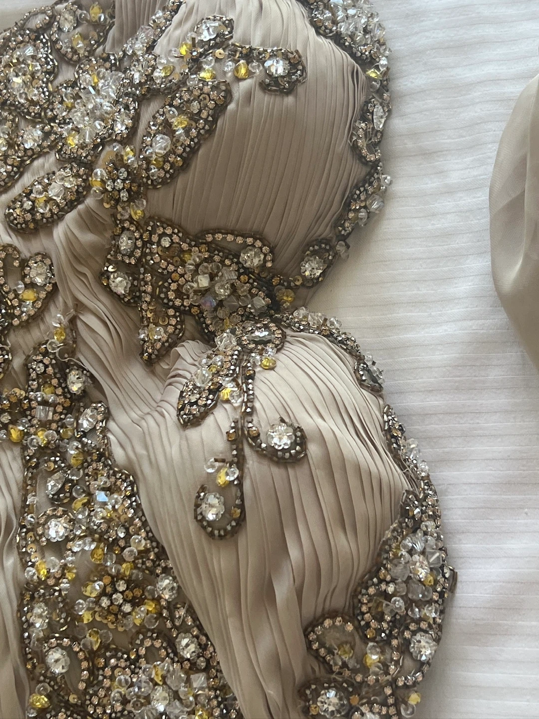 Selling a beautiful strapless baig dress with intricate beadwork. It's in great condition and would be perfect for a special occasion!