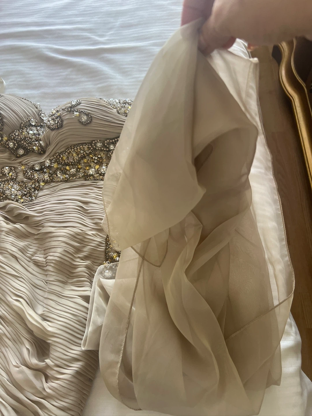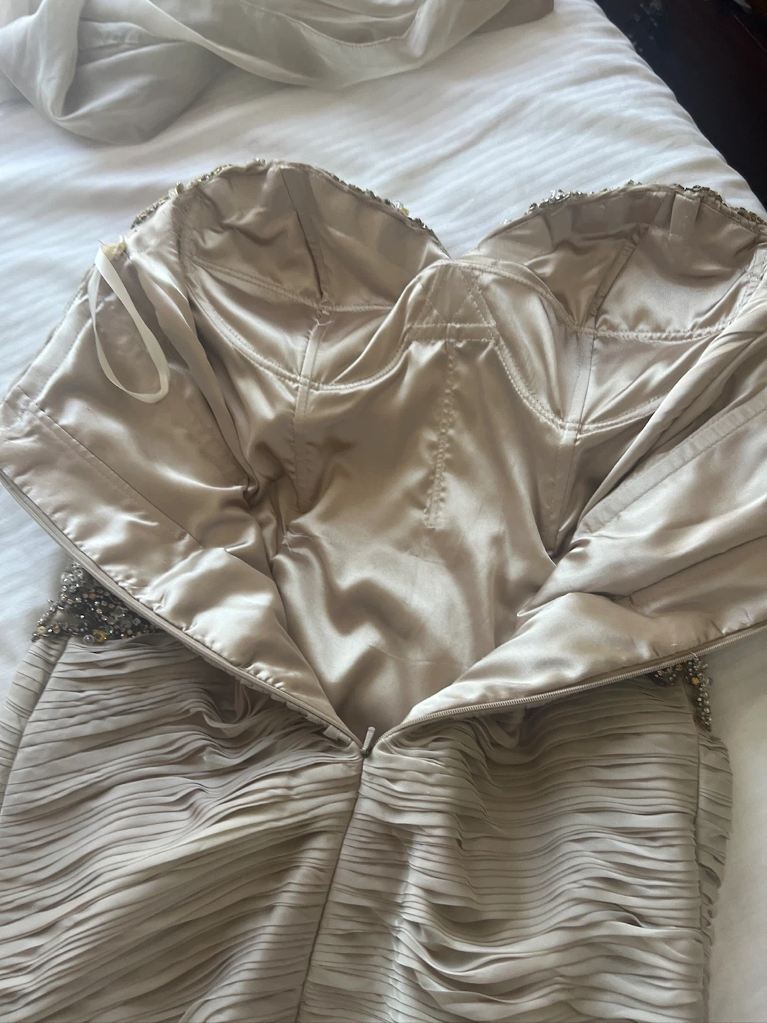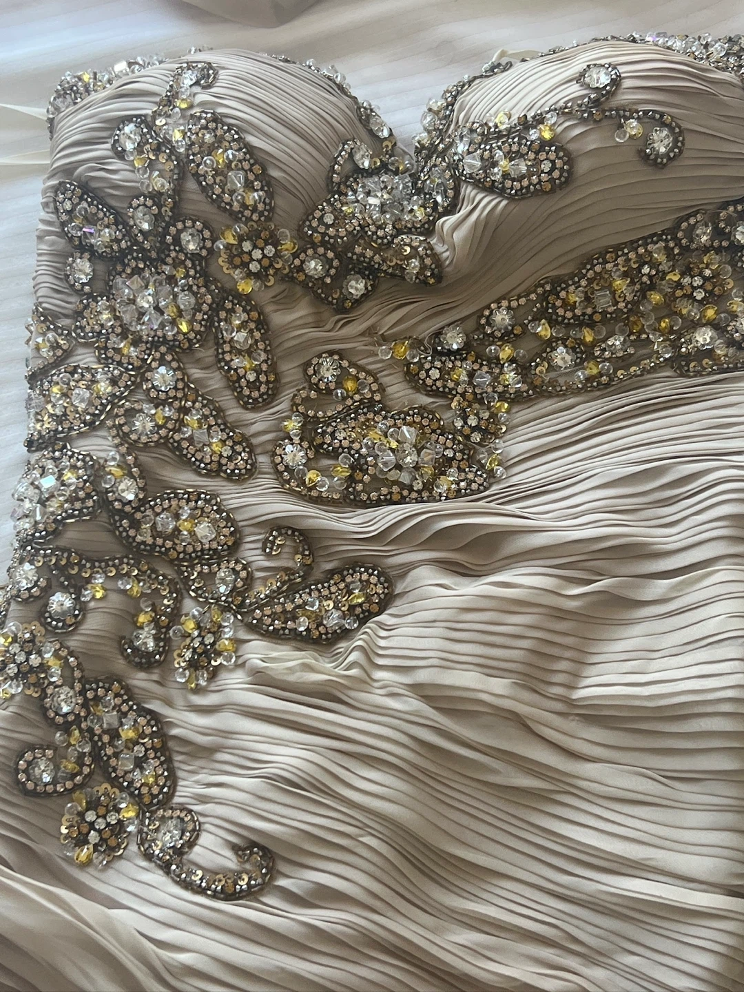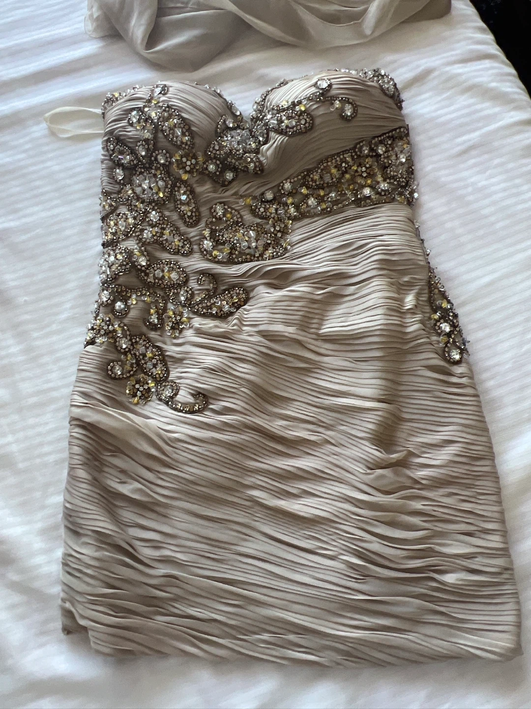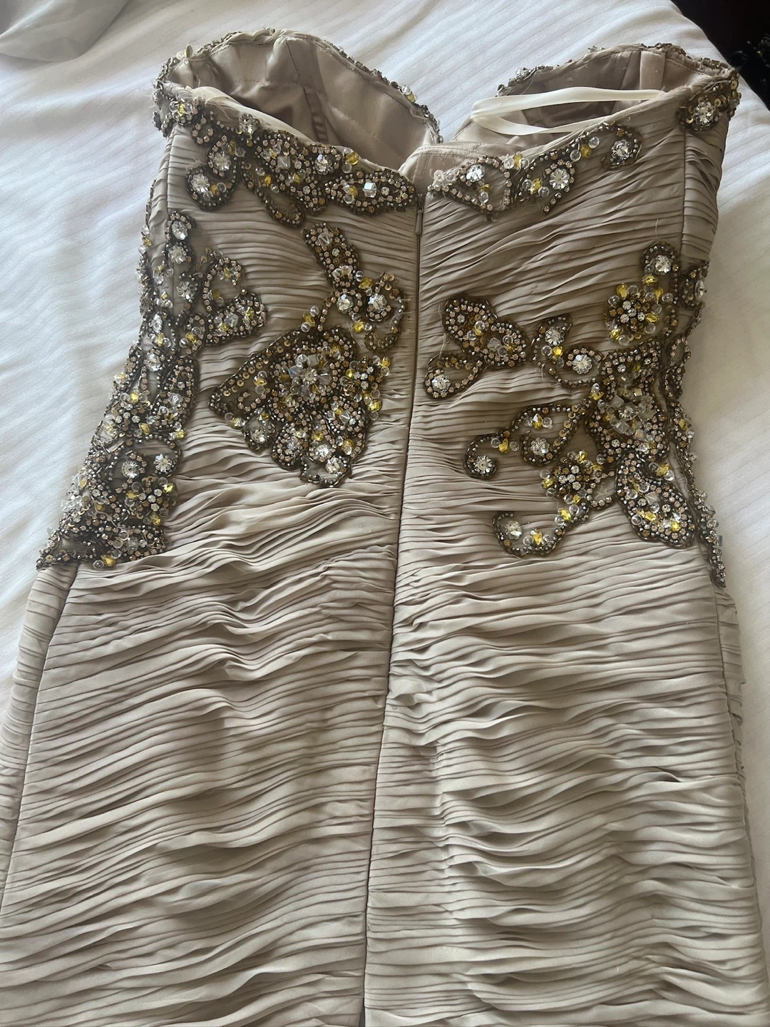 Selling a beautiful strapless baig dress with intricate beadwork. It's in great condition and would be perfect for a special occasion!