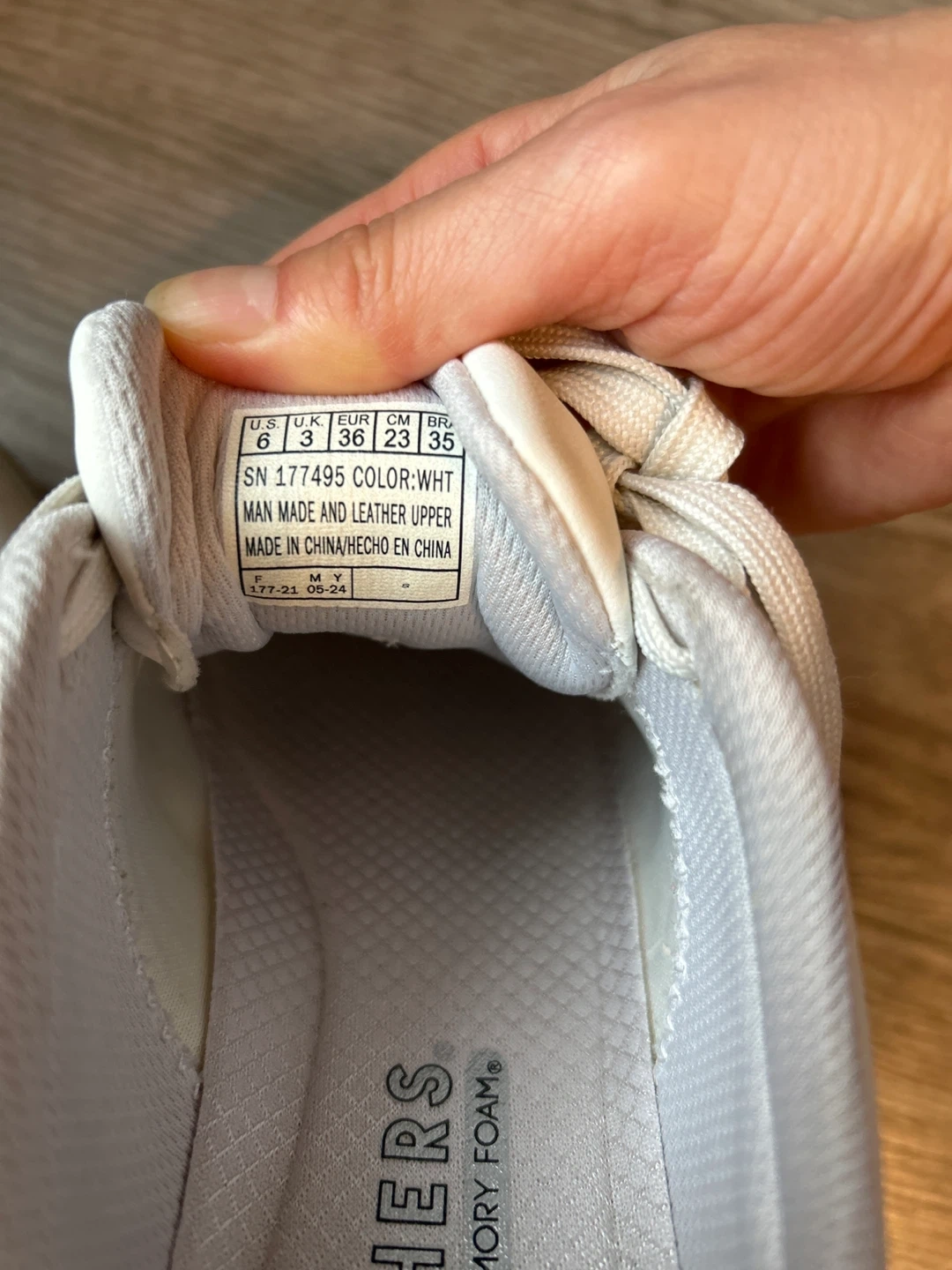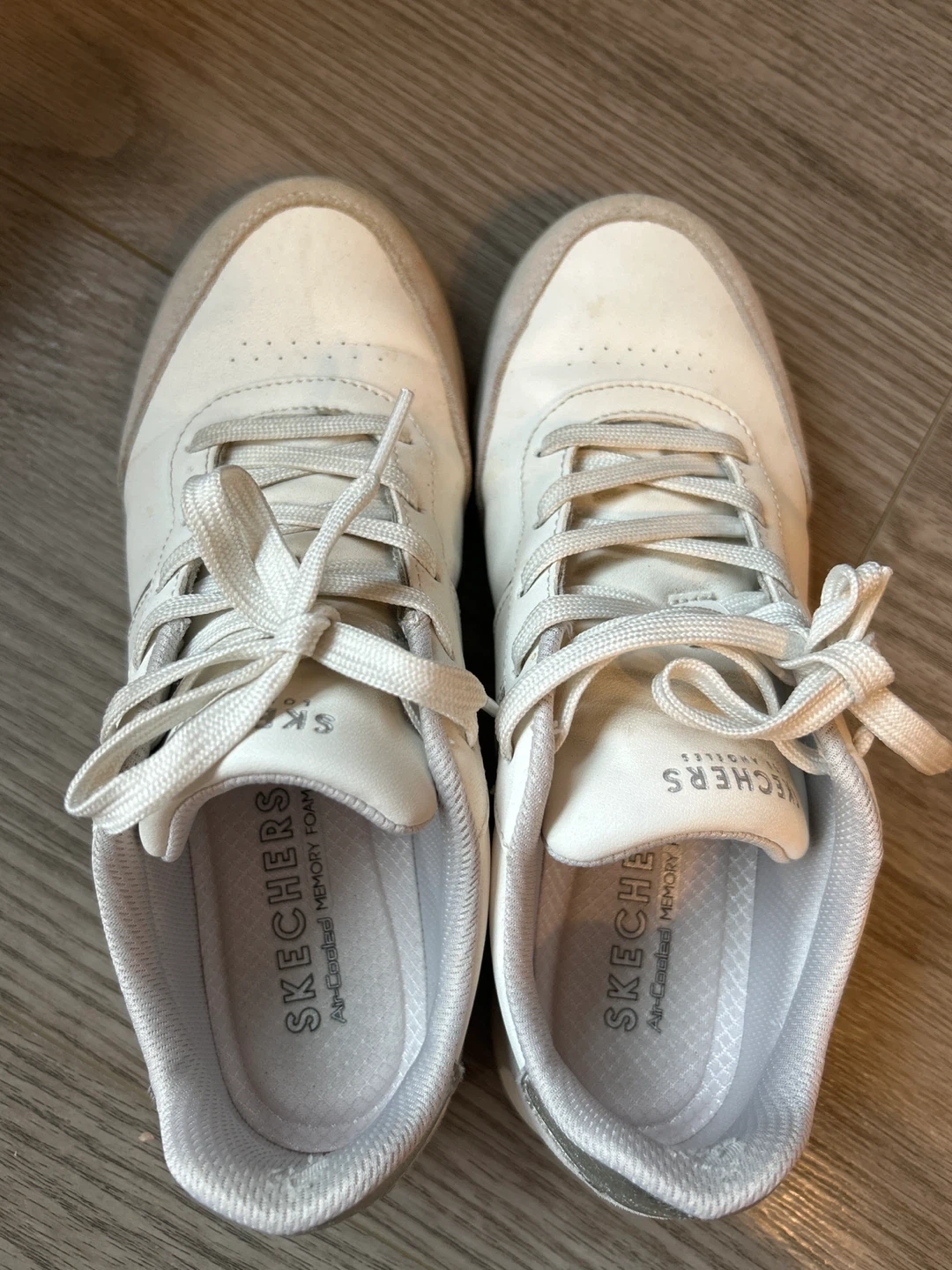 Selling a pair of Skechers sneakers in white. They are a size 6 US. The upper material is made of leather and man-made materials. These are super comfy with Air-Cooled Memory Foam