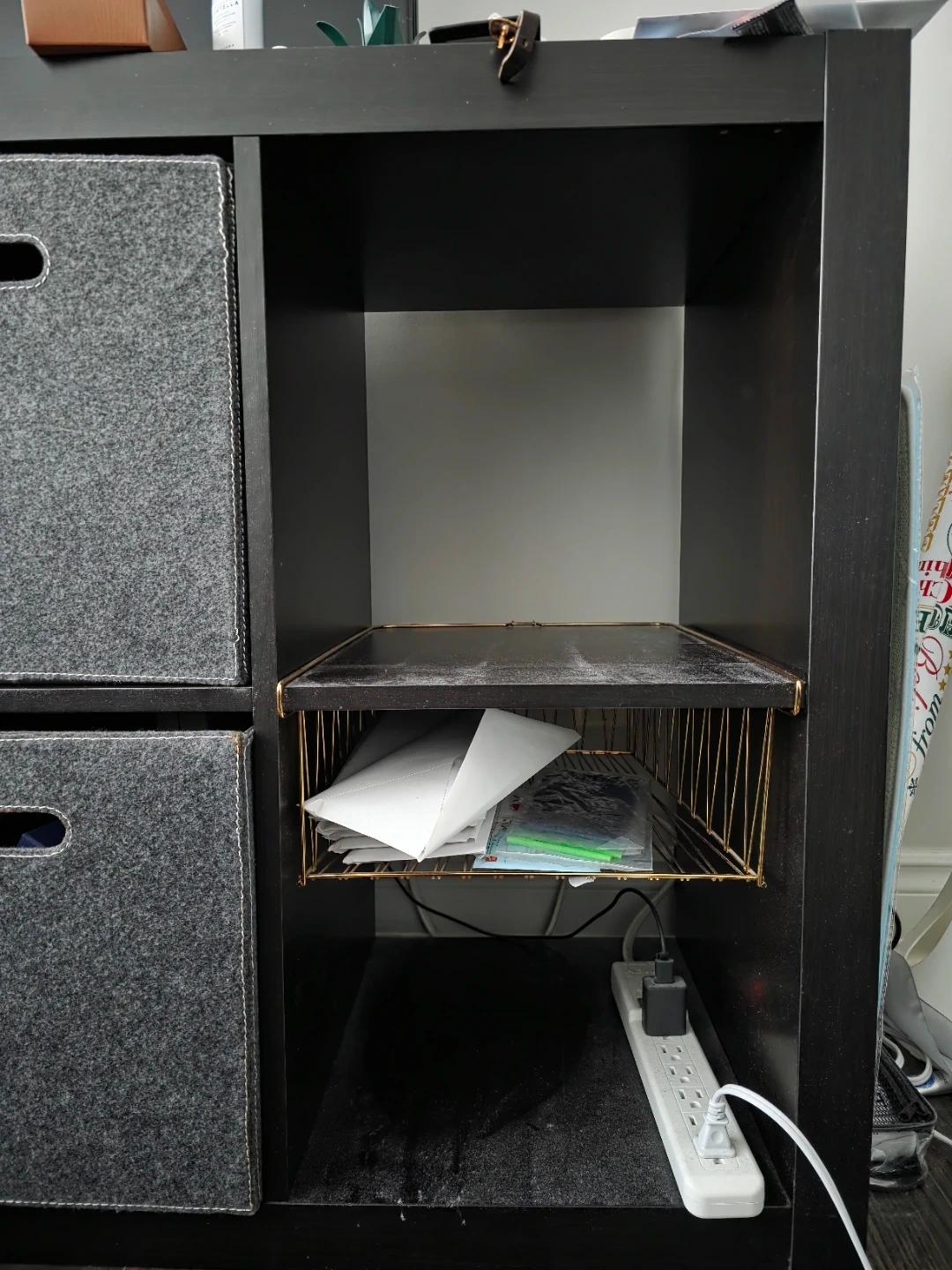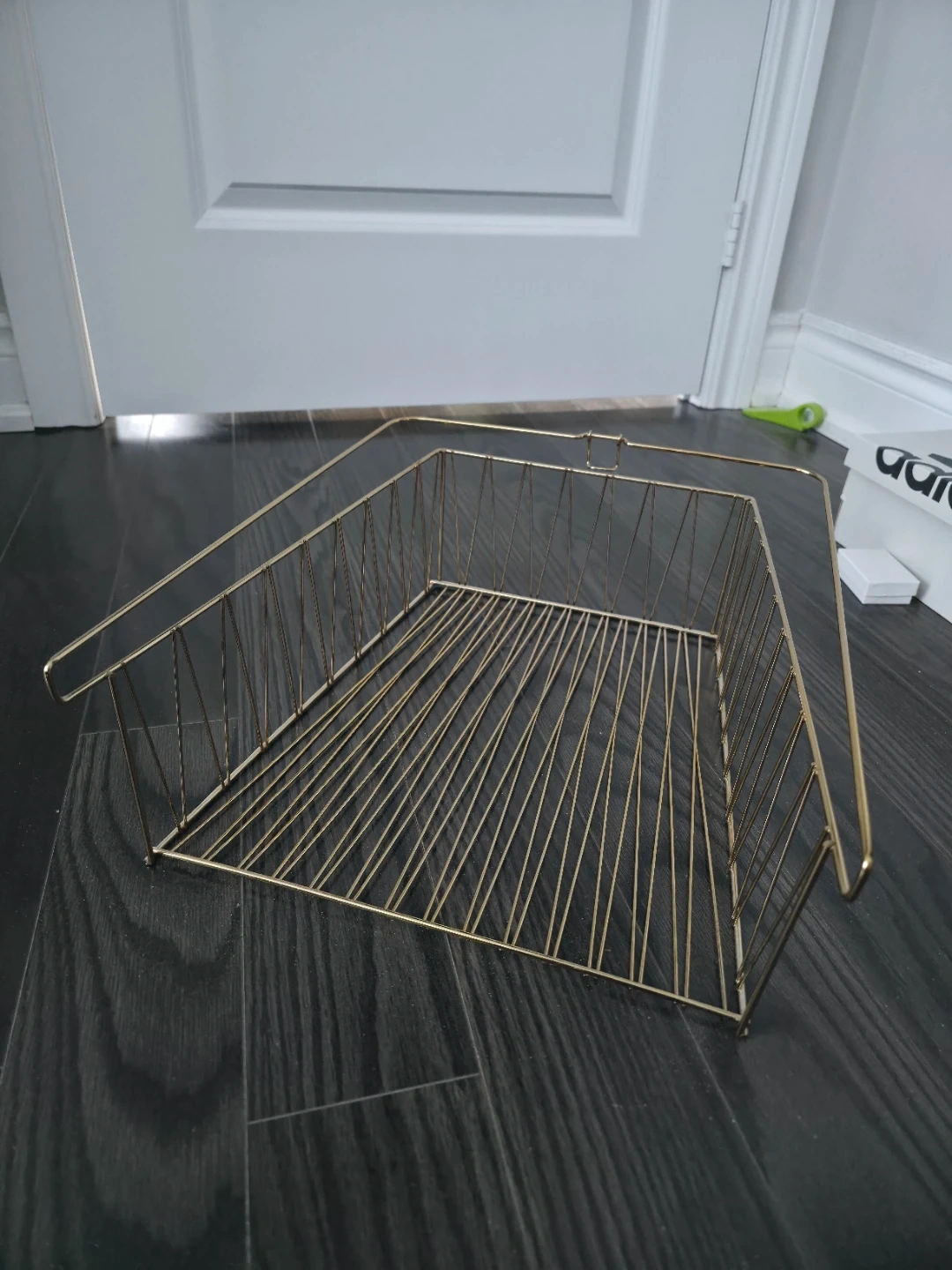 Selling a gold wire basket that fits perfectly into an IKEA Kallax shelf unit! It's in great condition and ready to add some stylish storage to your space. The dimensions are 40 cm (length) x 33 cm (width) x 14 cm (height)