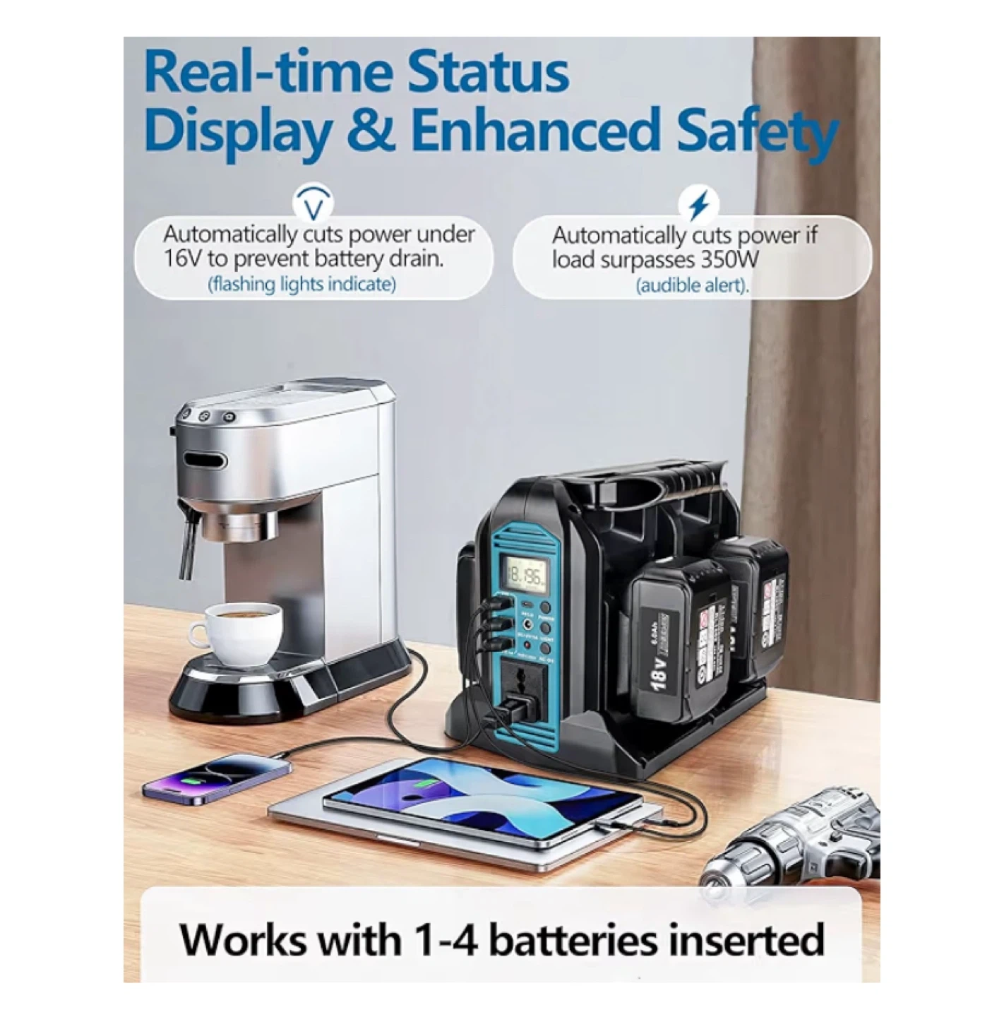 This portable power station is perfect for charging your devices on the go! It features a real-time status display and enhanced safety features. It automatically cuts power under 16V to prevent battery drain and if the load surpasses 350W. It can work with 1-4 batteries inserted.