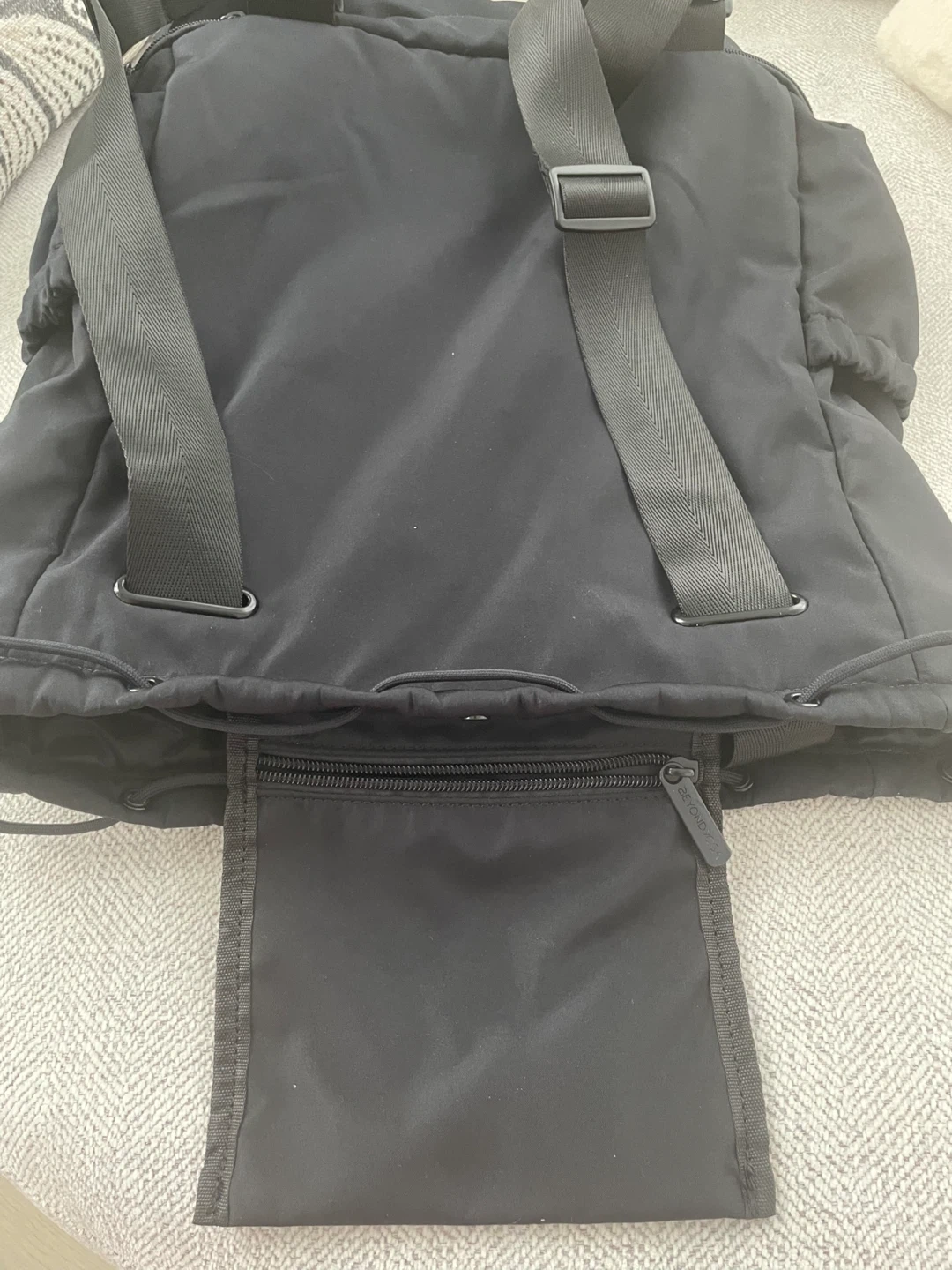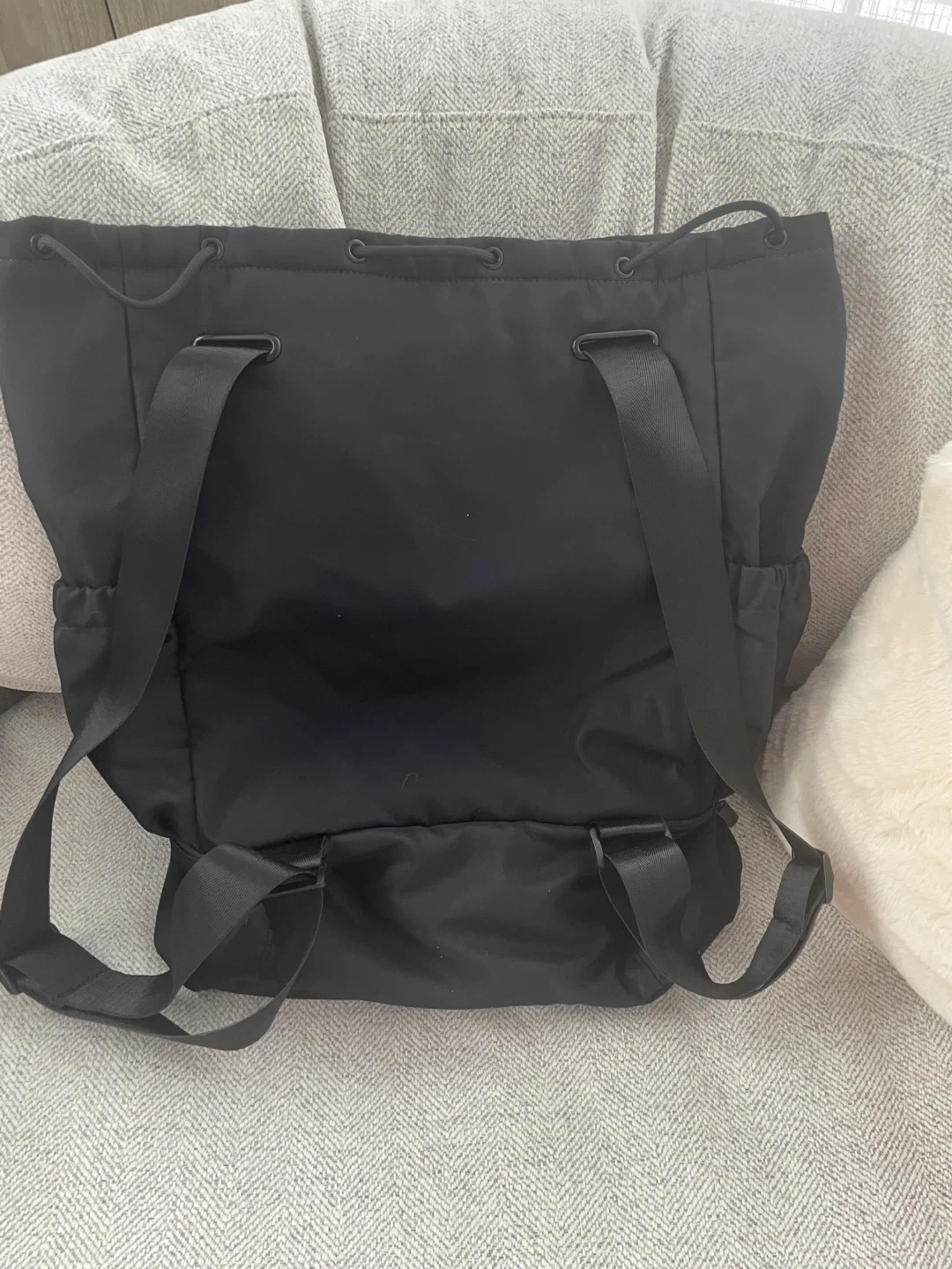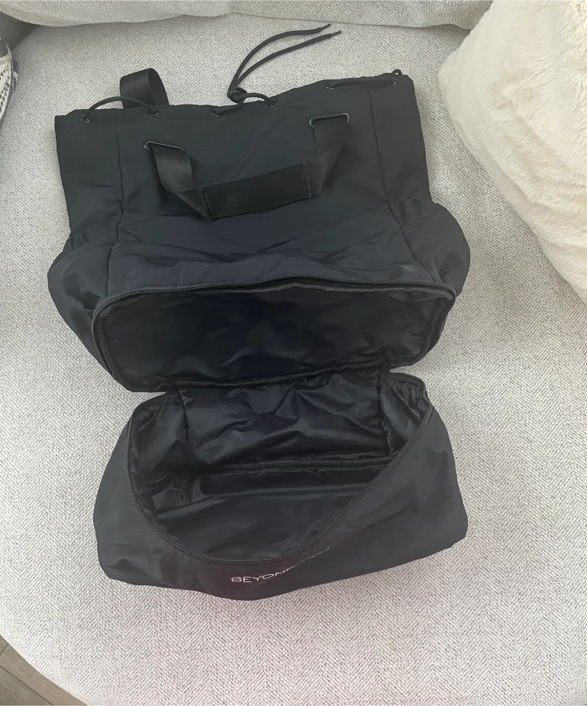 I'm selling a Beyond Yoga backpack tote bag in black. It's never been used and ready for a new owner! It has a sporty design with a top handle and adjustable shoulder straps. Small zipper pocket inside, perfect for keys or phone. Two elastic pockets on the side for water bottle or other essentials. Bottom zipper pocket for separate shoe storage.