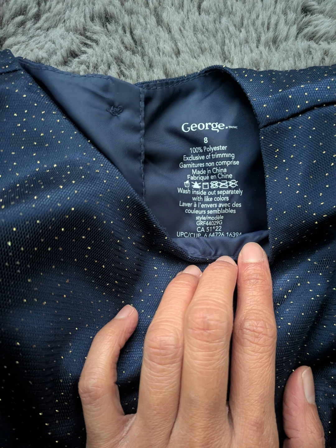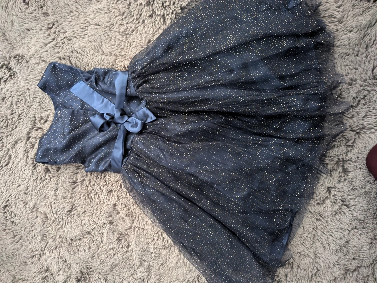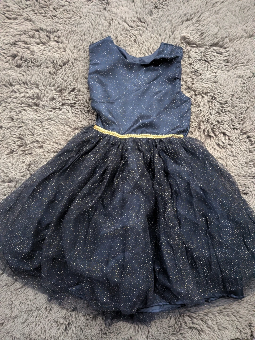 A cute girls' dress from George in size 8. It's a navy blue colour with gold speckles and tulle. Made of 100% polyester, exclusive of trimming. Perfect for parties or special occasions!