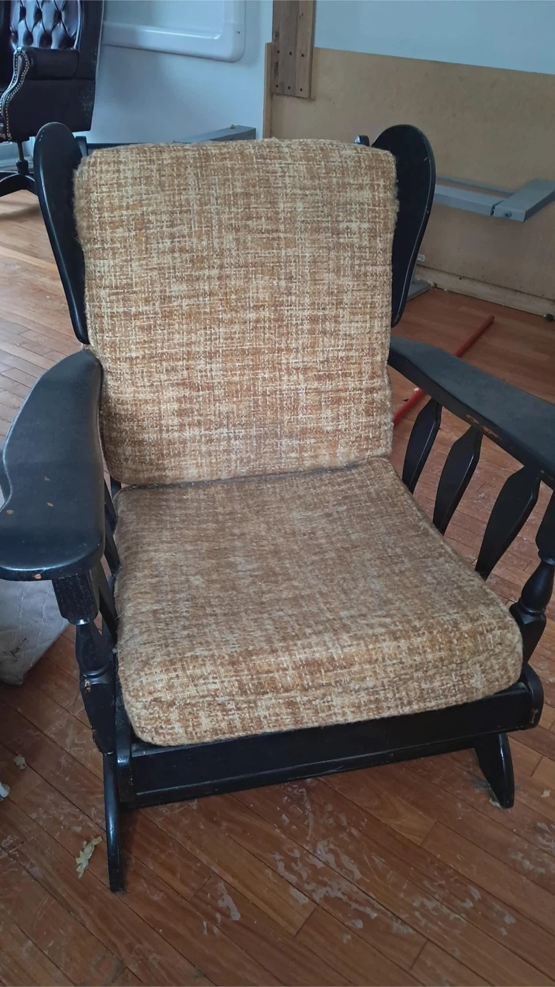 Selling a vintage rocking chair with a black frame and tan woven fabric cushions. It's in good condition and would be a cozy addition to any home!
