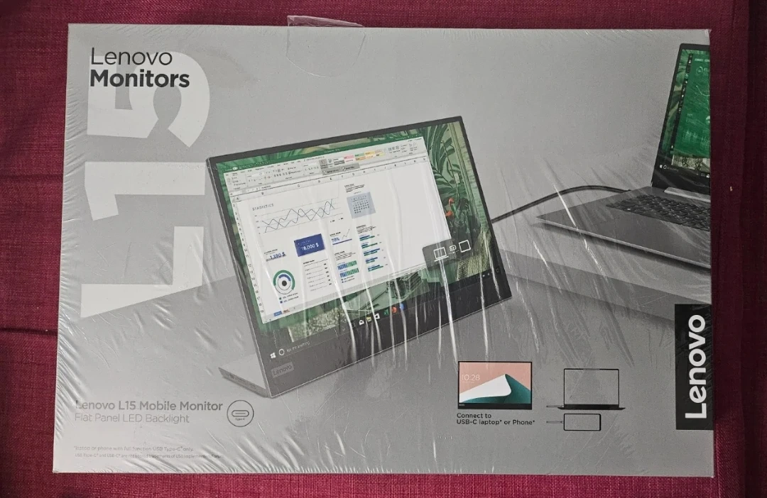 It's still in its original packaging. This is a flat panel LED backlit monitor that you can easily connect to your laptop or phone using a USB-C cable.
