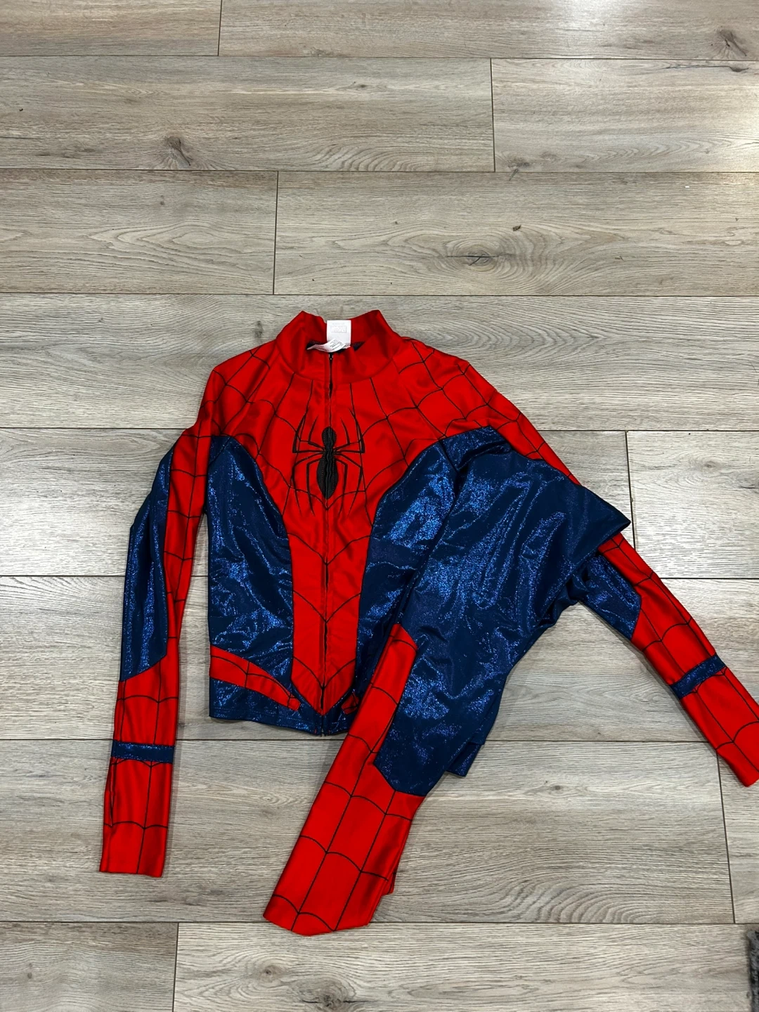 Selling a Spider-Man costume! It's red and blue, perfect for Halloween or dress-up. The material is shiny and eye-catching. It includes a jacket and pants.