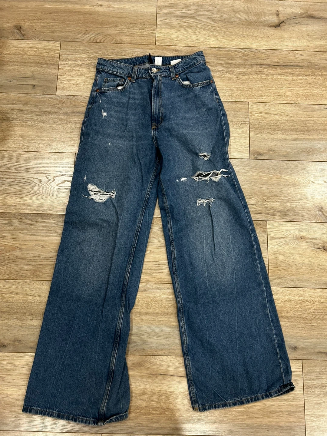 Selling a pair of H&M Divided jeans in size 6! They are a stylish, light wash denim with a wide leg fit and distressed detailing. Perfect for a casual look!