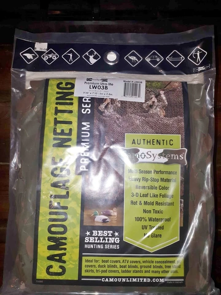 Approximately 10x8 foot camo netting, great for groundblinds, tree stands, or anything needing to be hidden in the woods. Mold and mildew resistant, waterproof and durable.