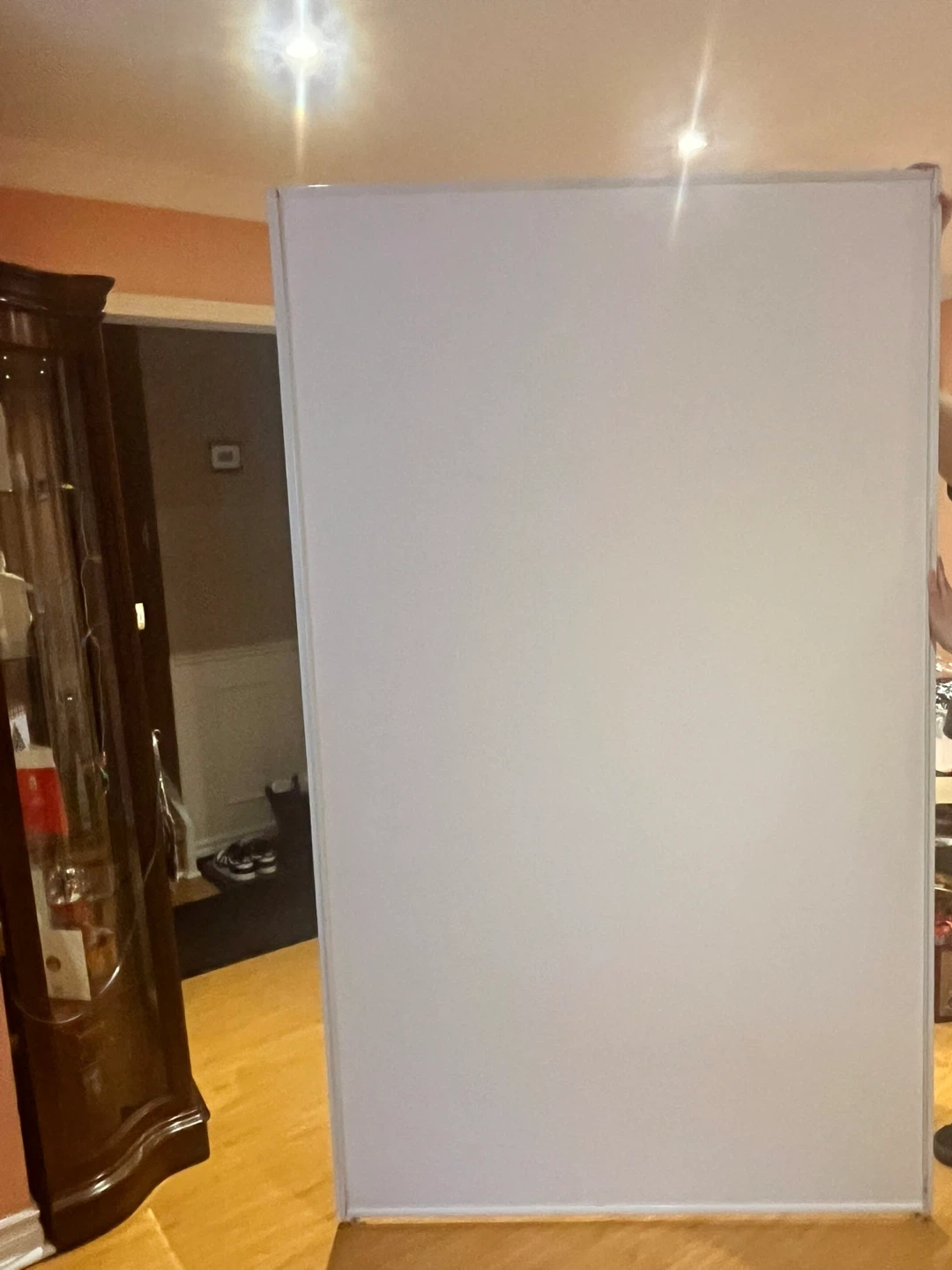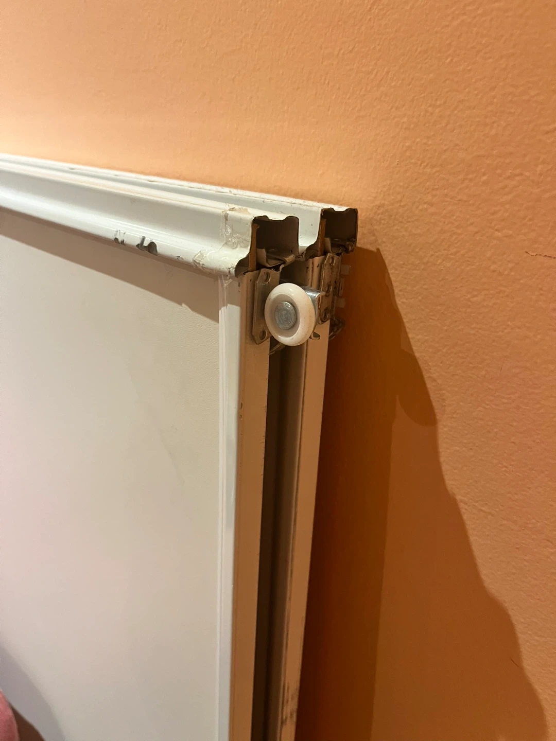 Selling a white sliding door. It's in used condition, with some wear and tear visible. Perfect for a closet or room divider project!
