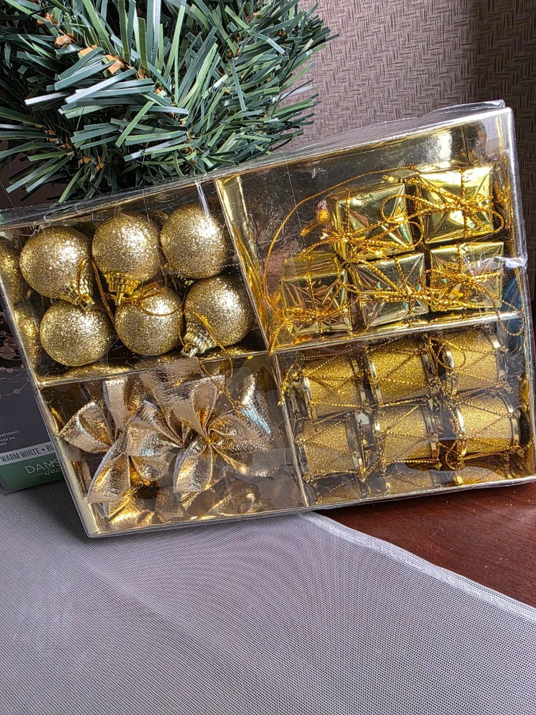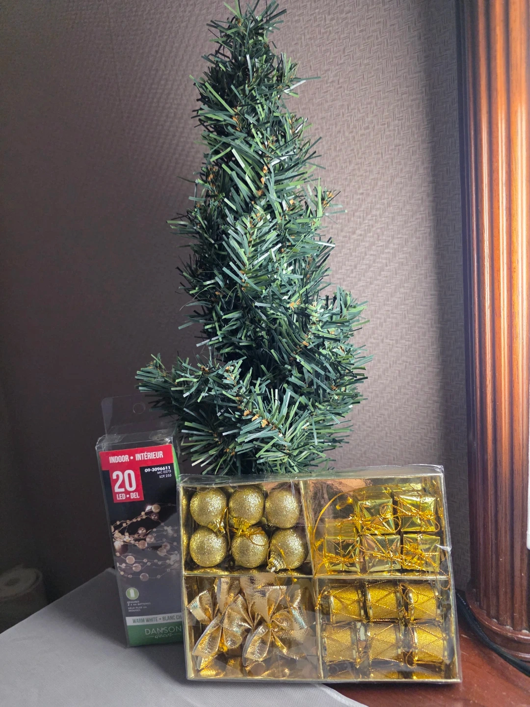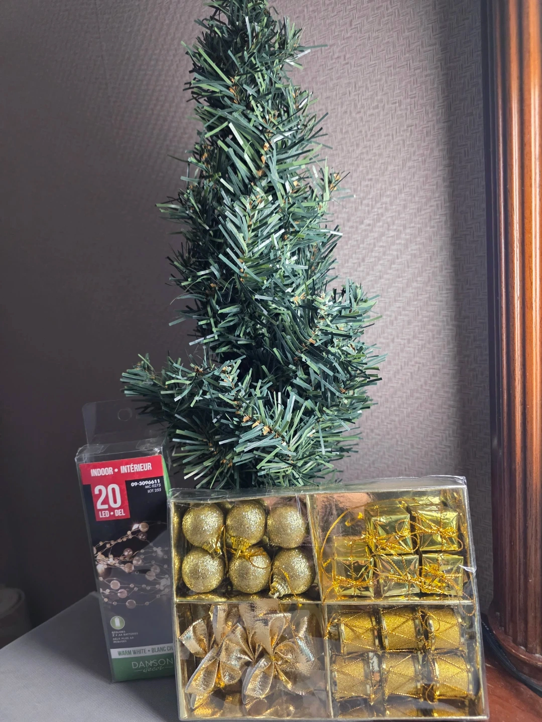 Selling a cute little Christmas tree, perfect for adding some festive cheer to a small space! It comes with a set of golden ornaments including balls, wrapped presents, and bows. Also included are 20 LED warm white lights to make it sparkle