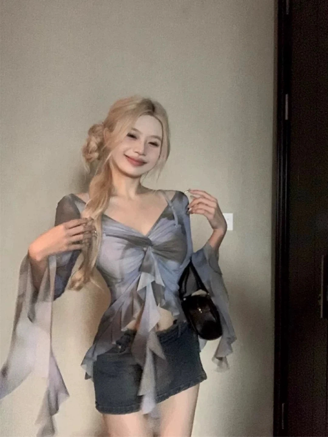 Selling a cute tie-front mesh top in a grey colour. It has long sleeves and a tie at the front. Perfect for layering or wearing on its own!