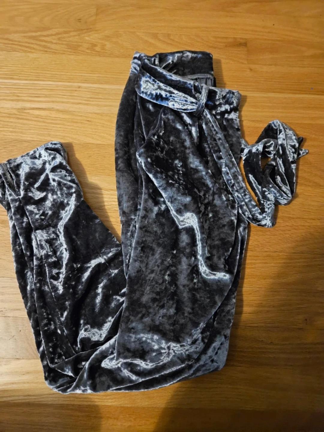 Selling a pair of crushed velvet pants! They are in great condition and would be perfect for lounging or dressing up. The material is soft and comfortable, and the colour is a lovely greyish-blue & it has a cute belt!