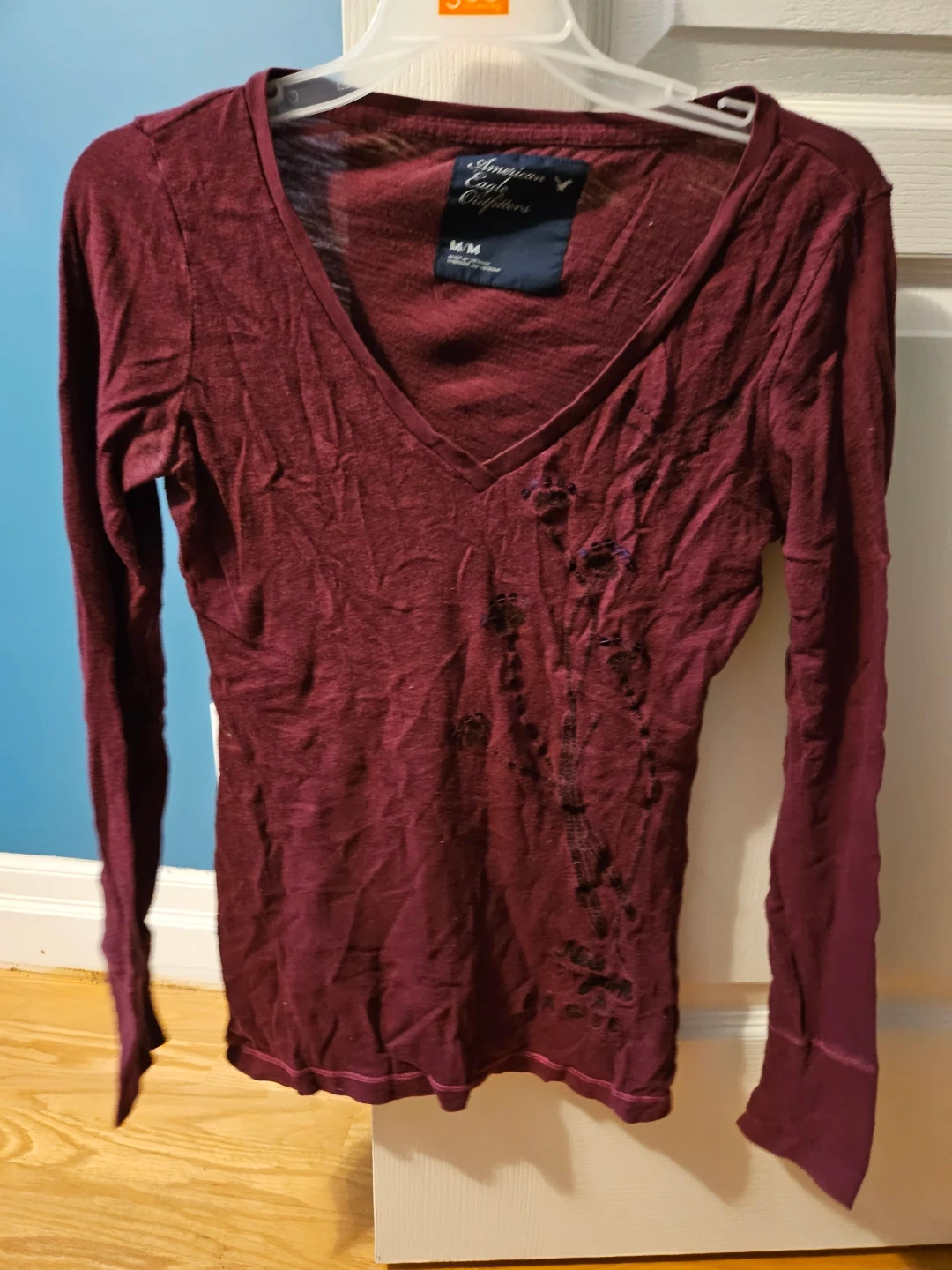 Selling a long-sleeved burgundy top from American Eagle Outfitters. It's a size S/M. It has a V-neck and some cute floral detailing on the front