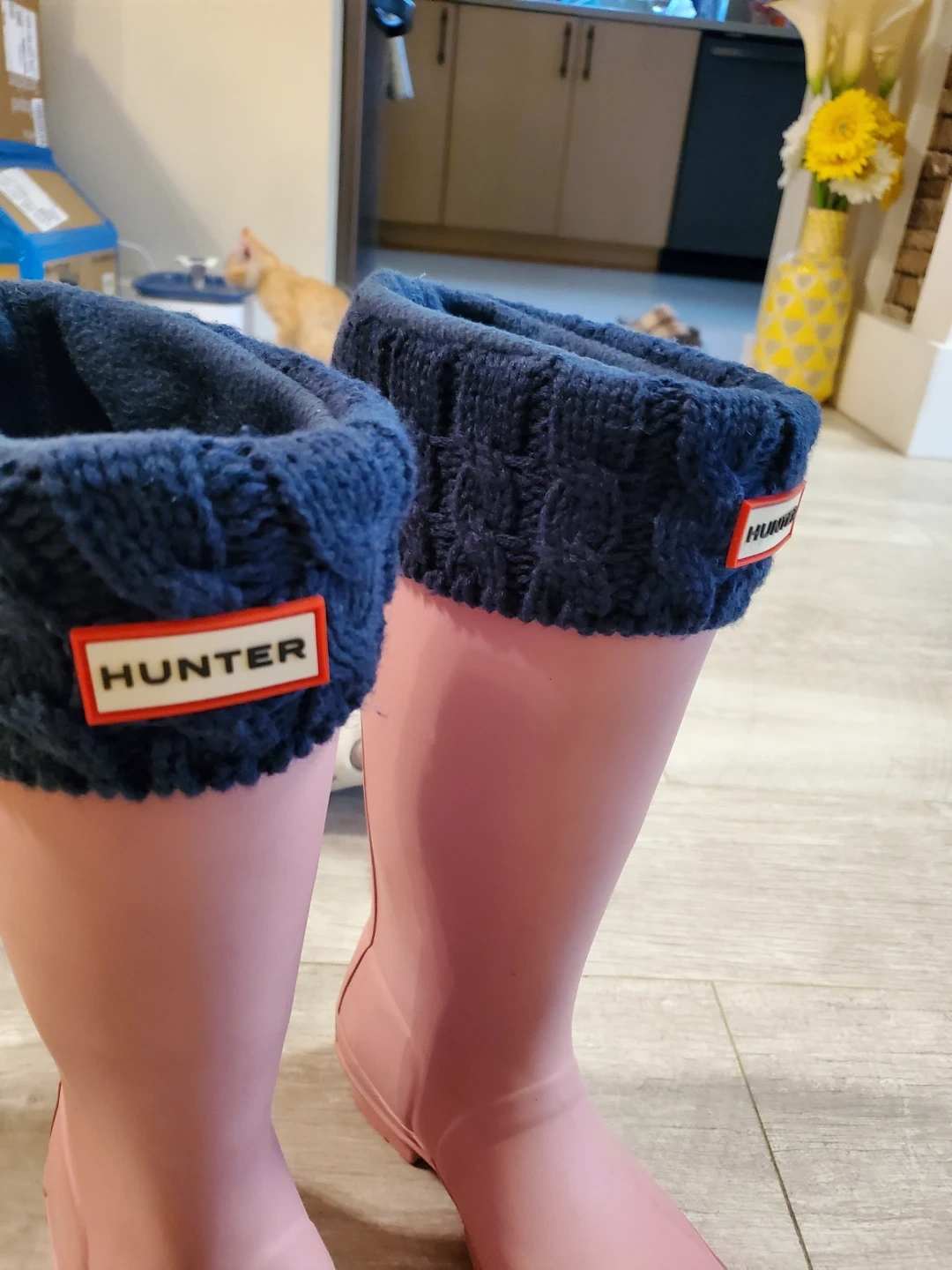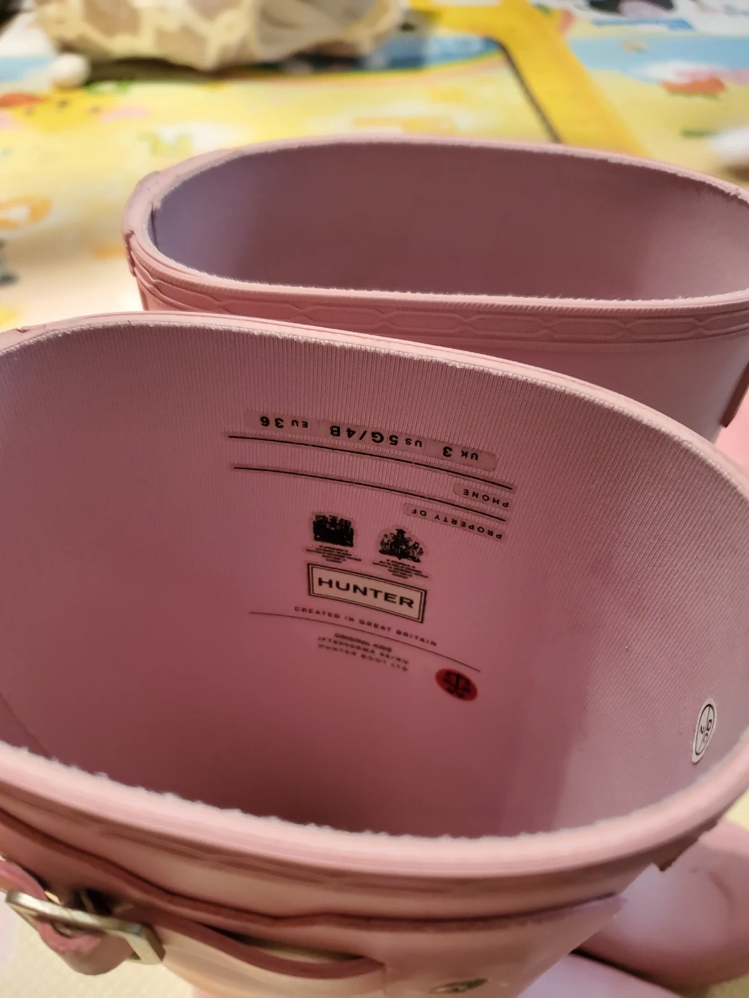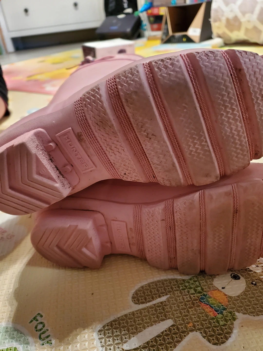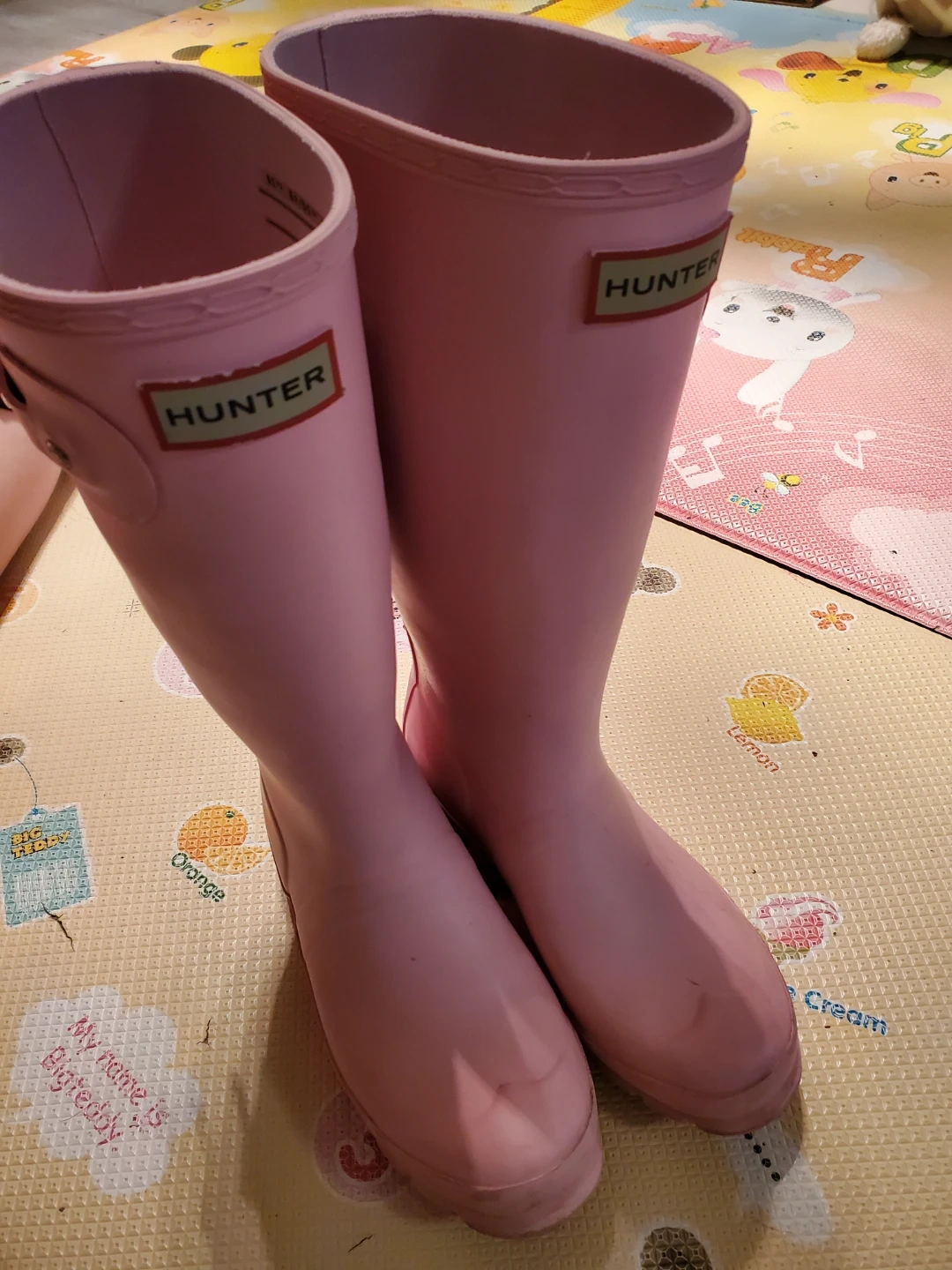 Selling a pair of pink Hunter rain boots in US size 5. They're in good condition, ready for some puddle-jumping fun!