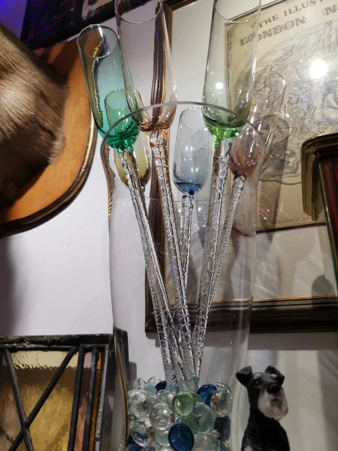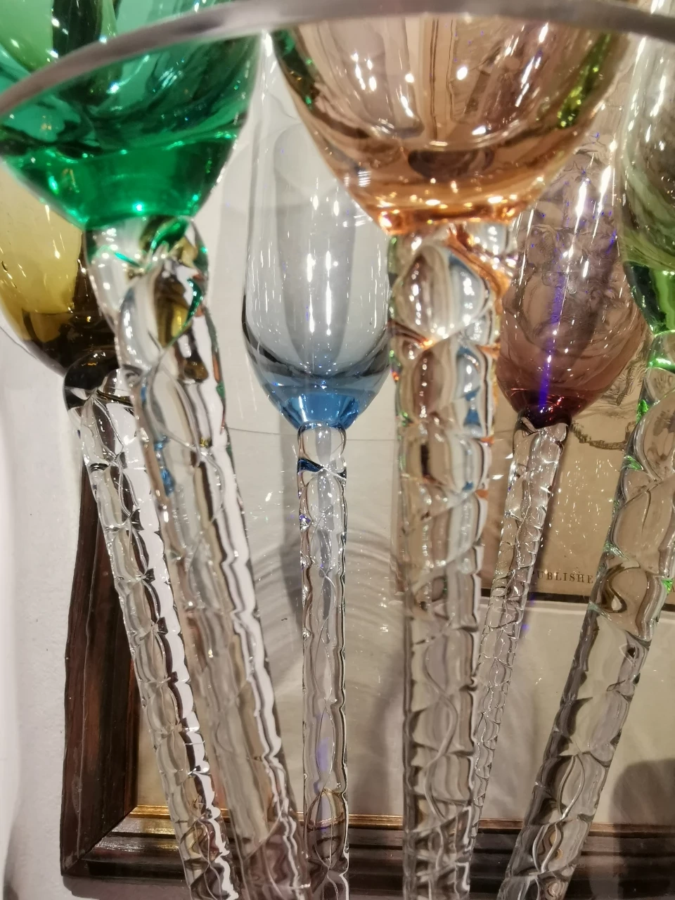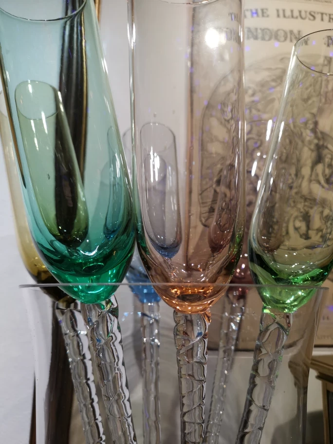 Vintage 1960's hand blown coloured 6 long stem Champagne Flutes