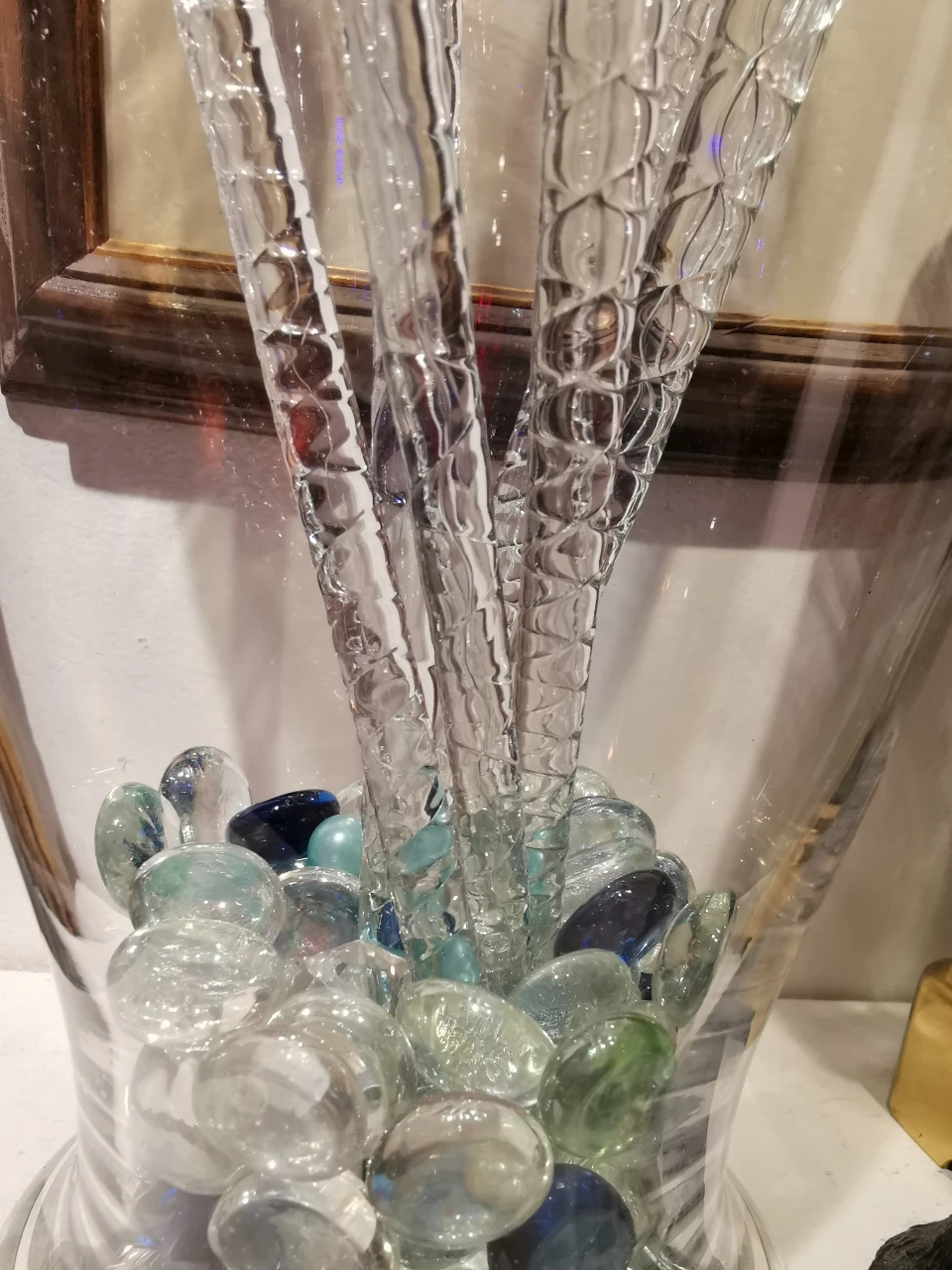 These have been in my family for at least 50 yrs. My parents purchased them from an artist in Muskoka in 1965. They have no base however I will include the crystal vase they sit in