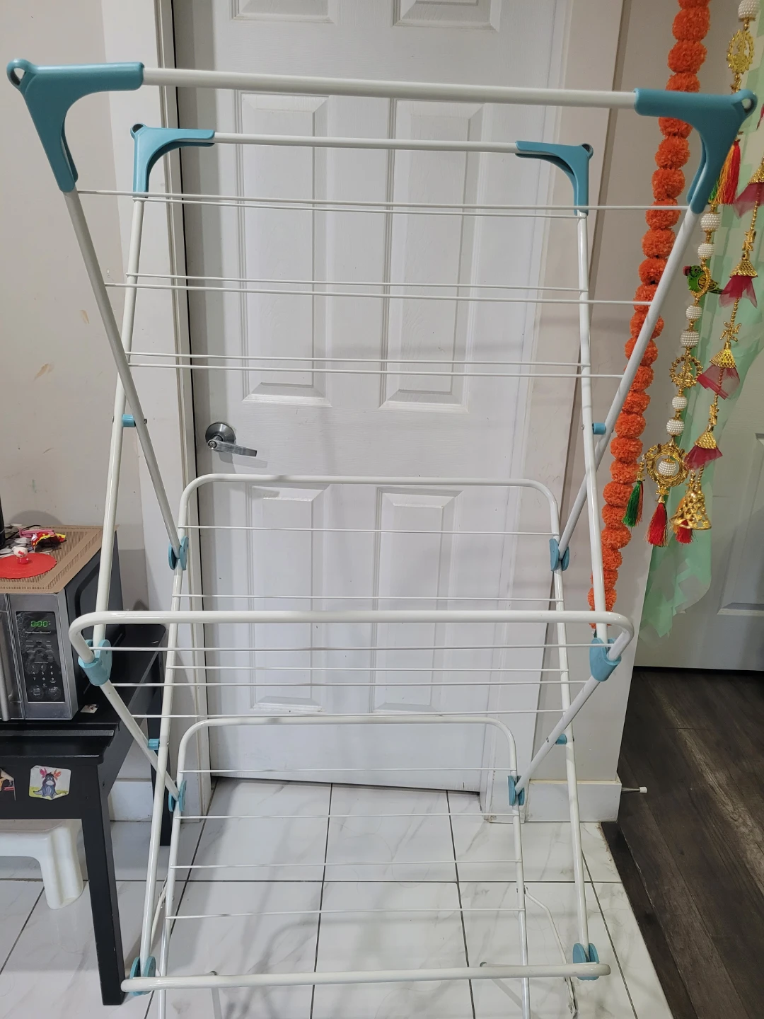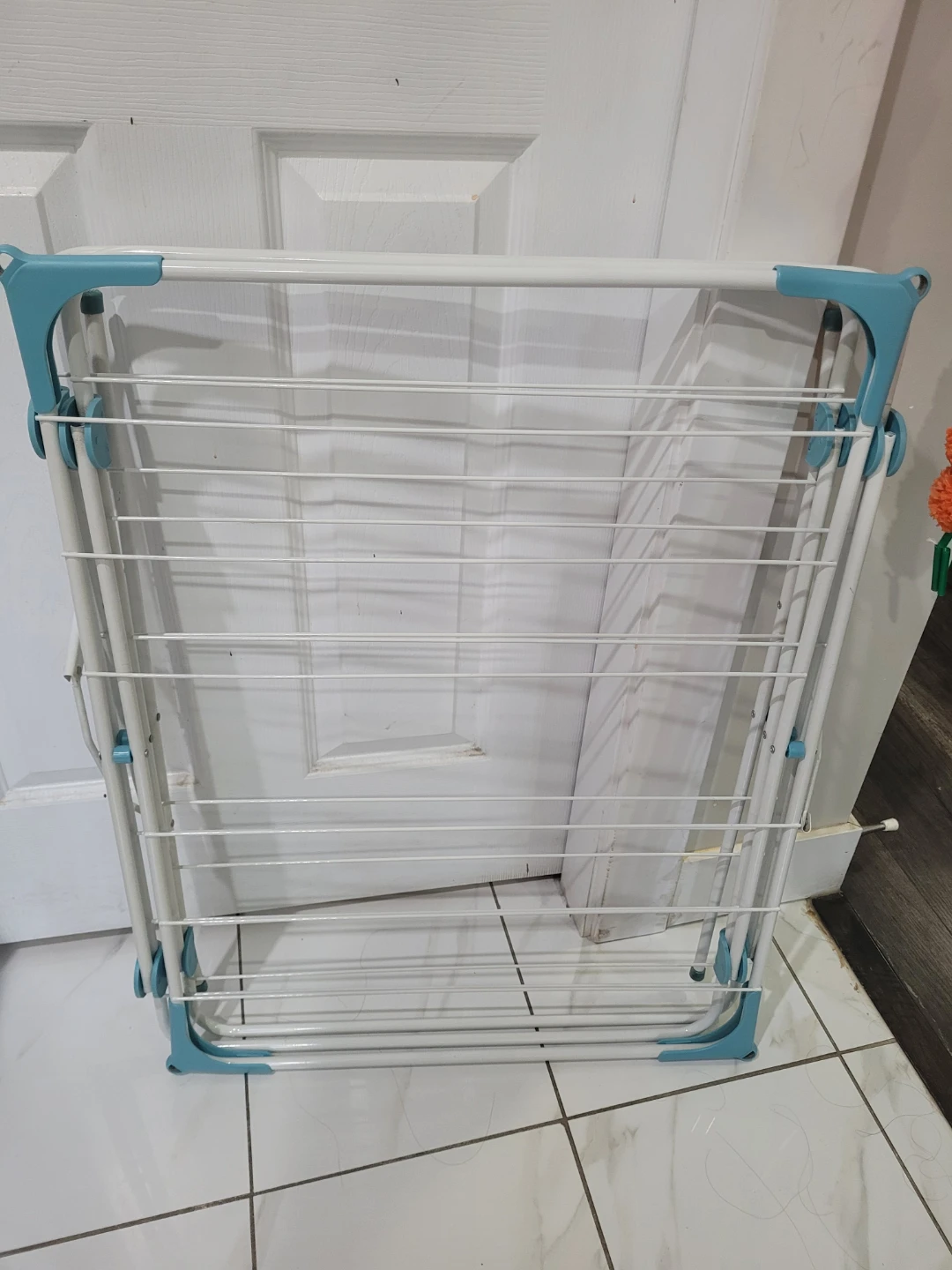 Selling a folding clothes drying rack in excellent condition. It's white with blue accents and folds up for easy storage. Great for saving space and drying clothes indoors!