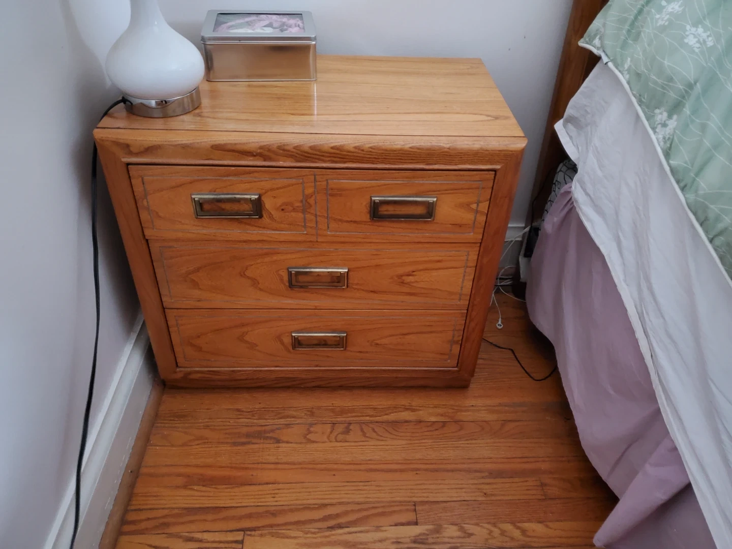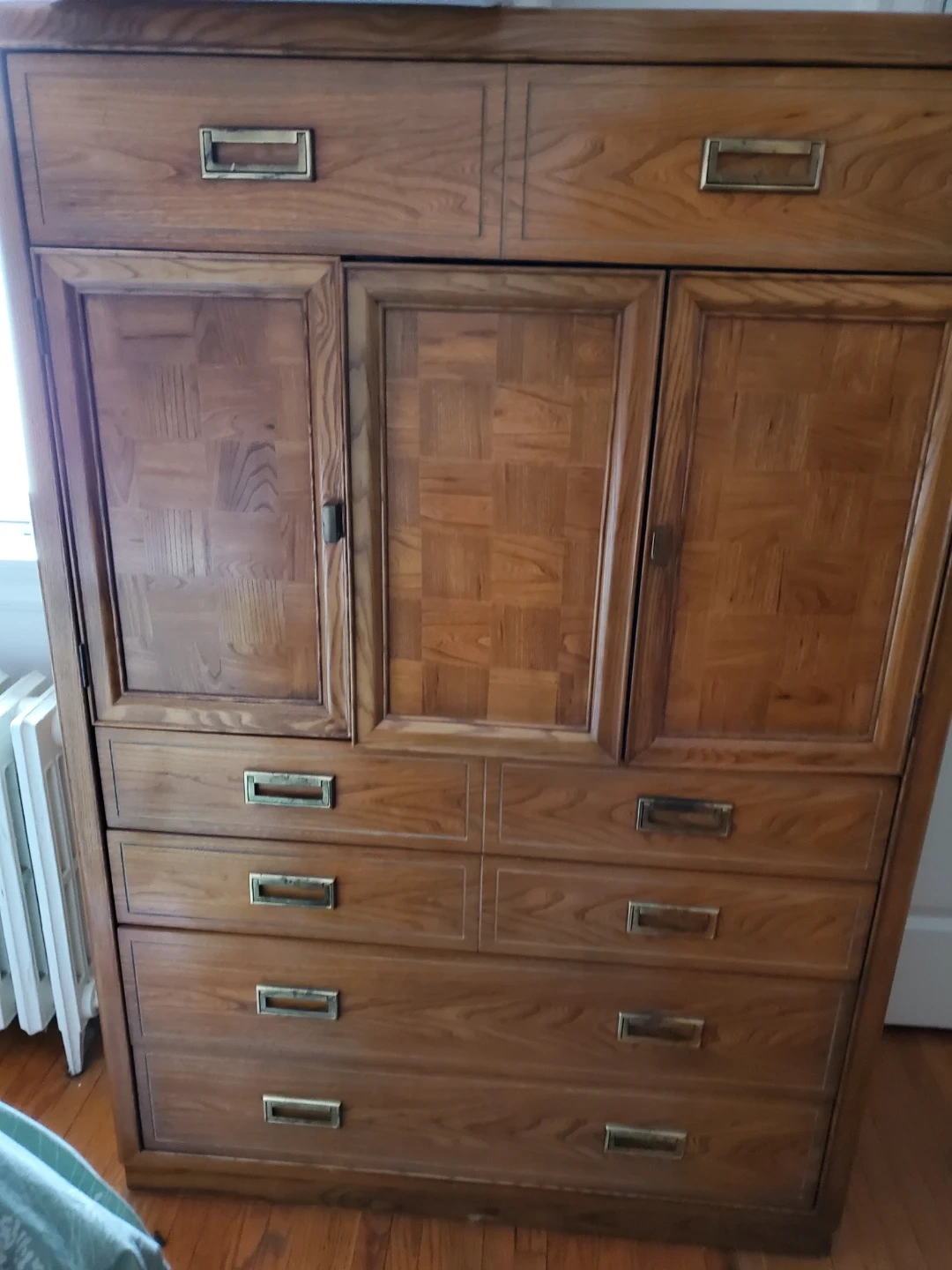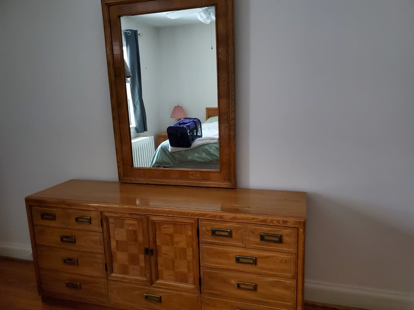Selling a wood dresser set. It includes a nightstand, a dresser with a mirror, and a tall dresser. All pieces are in good condition and have a matching design.