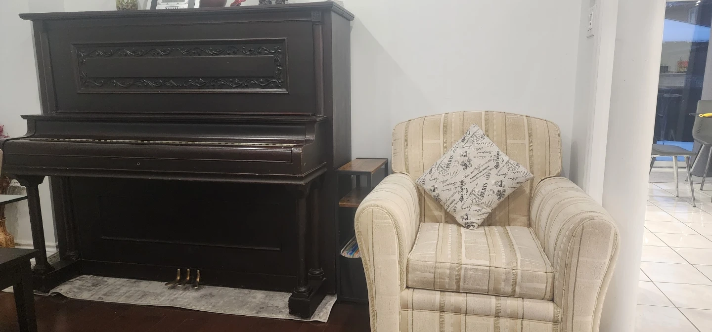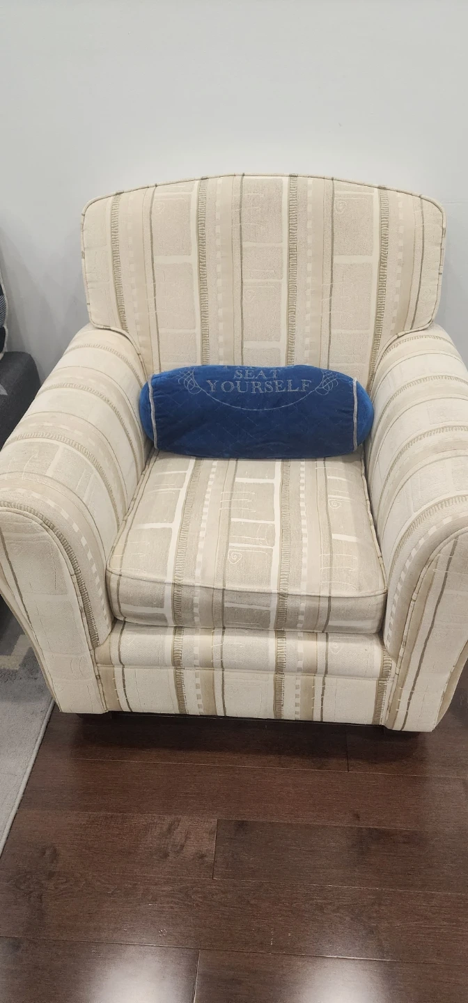 Canadian made comfy & sturdy armchair with a striped pattern and structure made with real wood. ! It's in great shape and would be a perfect addition to any living room or reading nook. 2 matching chairs available. Rent a steam cleaner from Home Depot - this chair would look brand new again. Better than buying Ikea, wayfair furnitures made with particle boards. Reorganizing family room to make space for kids home work corner.