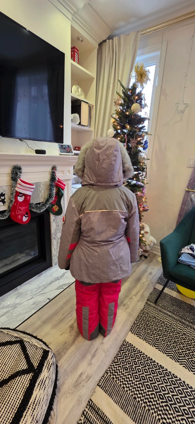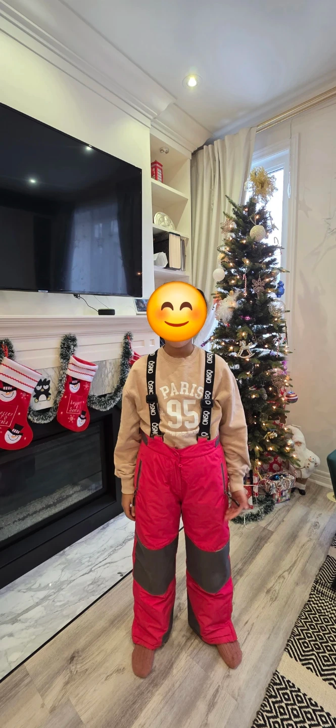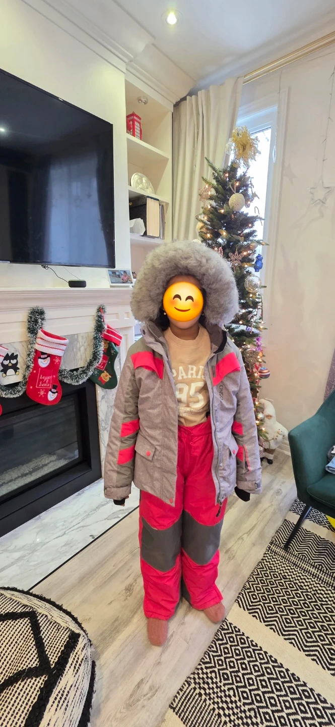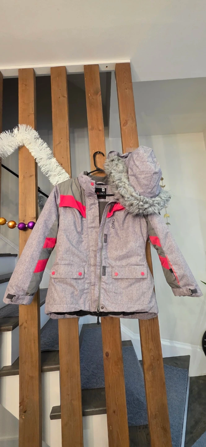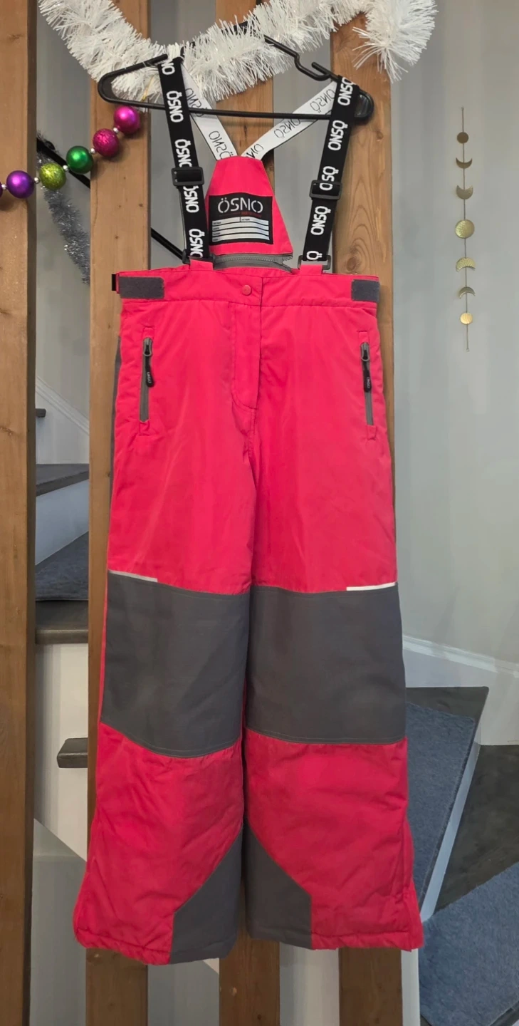 Selling a kids' snow pants and jacket set from OOSNO. The set is pink and grey. It's in great condition and ready for the winter season!