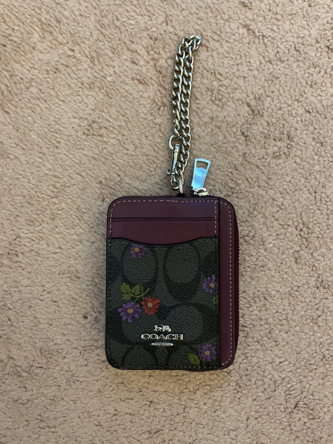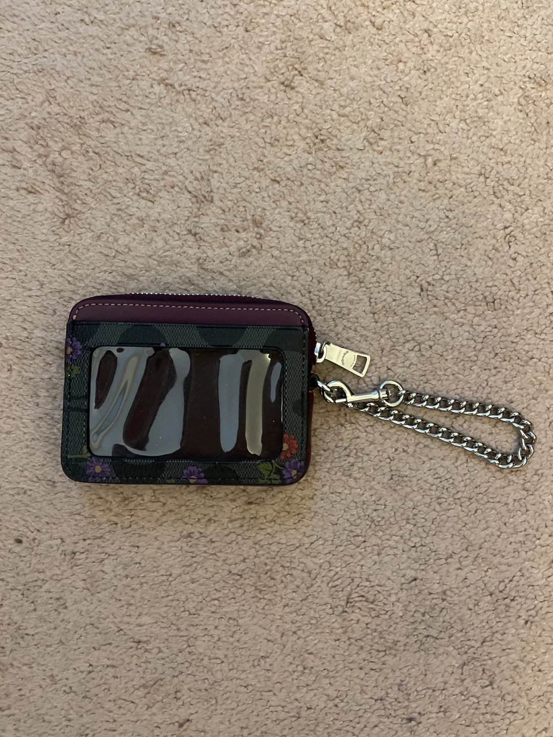 Selling a cute Coach card case with a floral print and chain attached. It's perfect for holding your cards and has a zippered compartment for cards/coins. The design features the classic Coach logo with a colourful floral pattern. It's in great condition and a clear id slot. Best offers and price is negotiable.