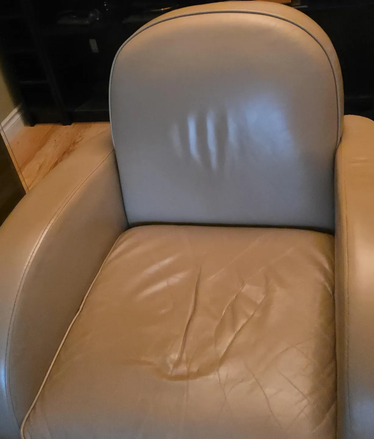 Selling a comfy beige leather armchair. It's in good condition and perfect for a reading nook or living room. It has a few signs of use, as pictured, but still has lots of life left!